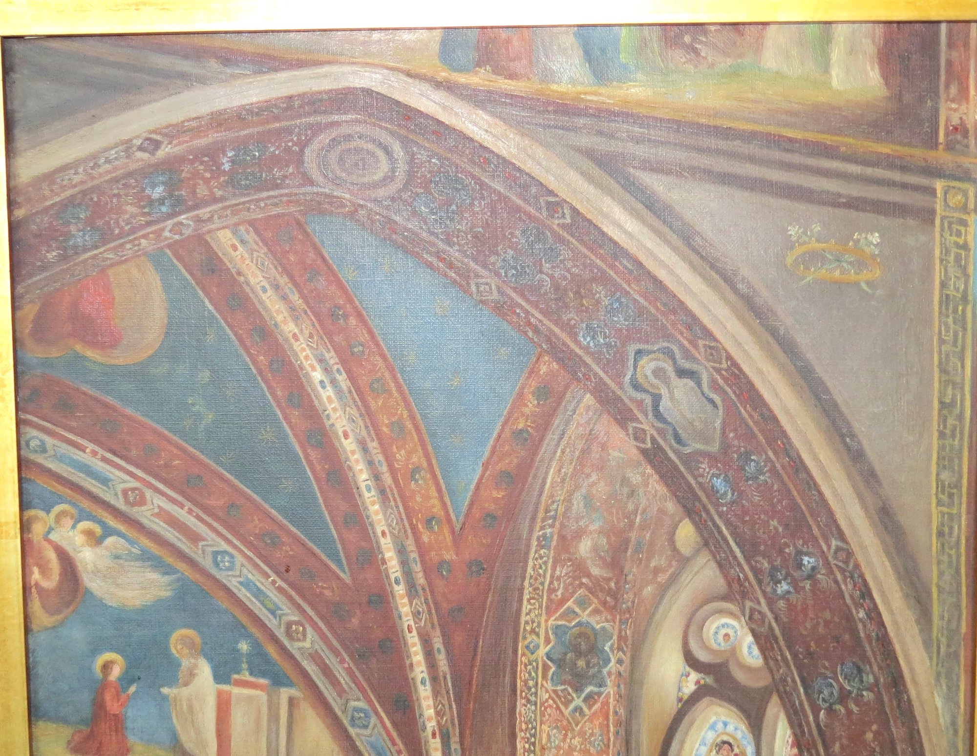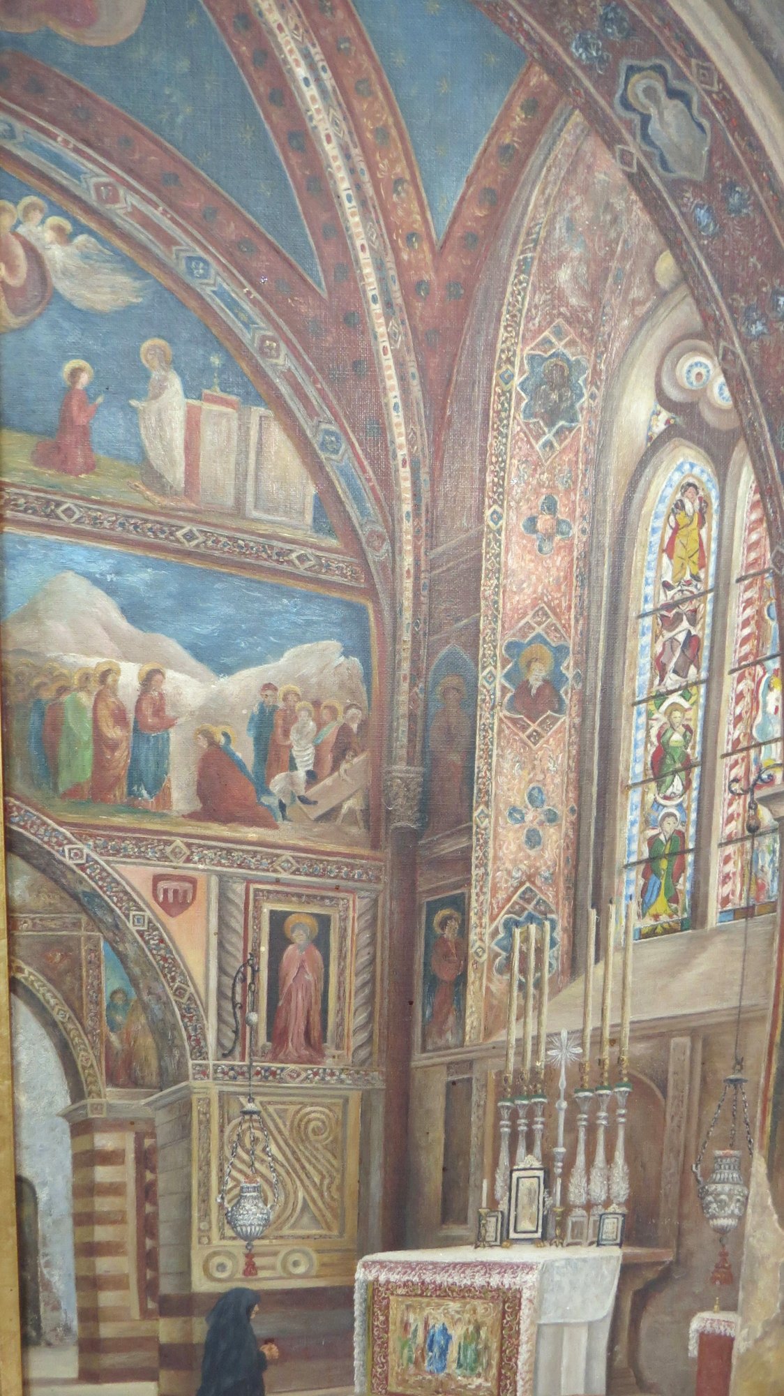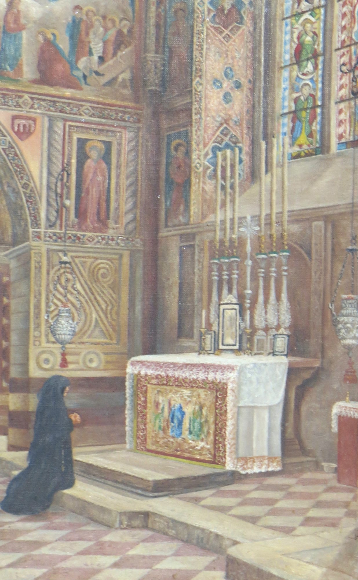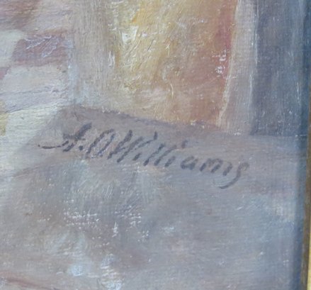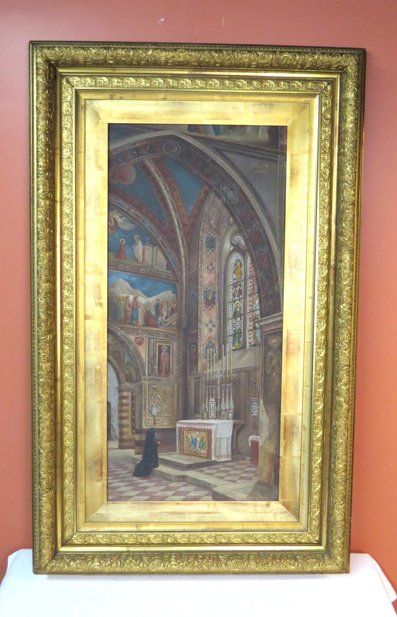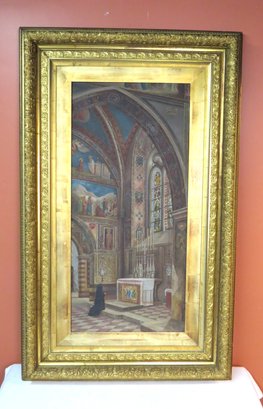O/C “Kneeling at the Altar” signed A. O. Williams, 30” h. x 14” w. sight, original gold leaf frame. Painting and frame excellent condition.