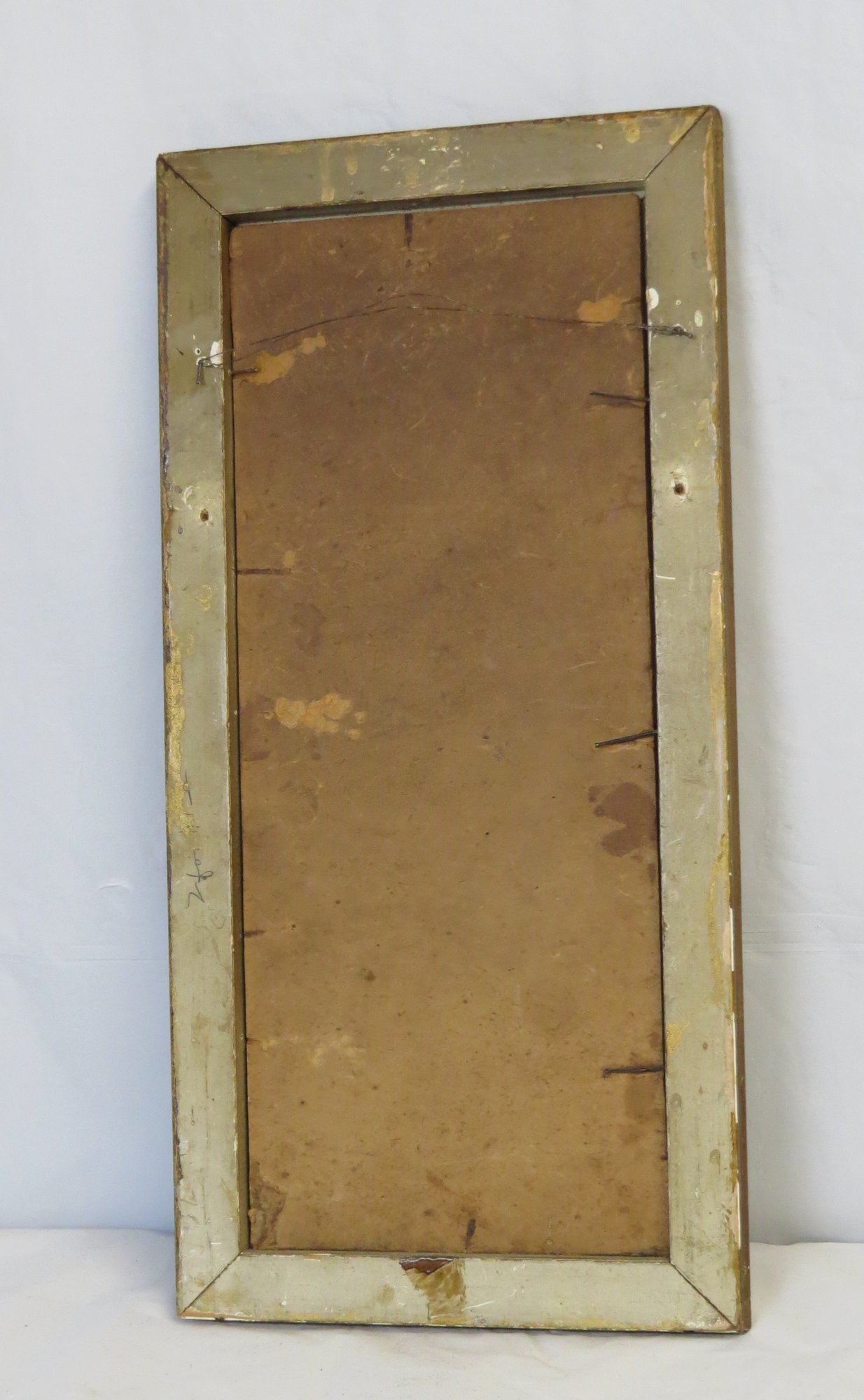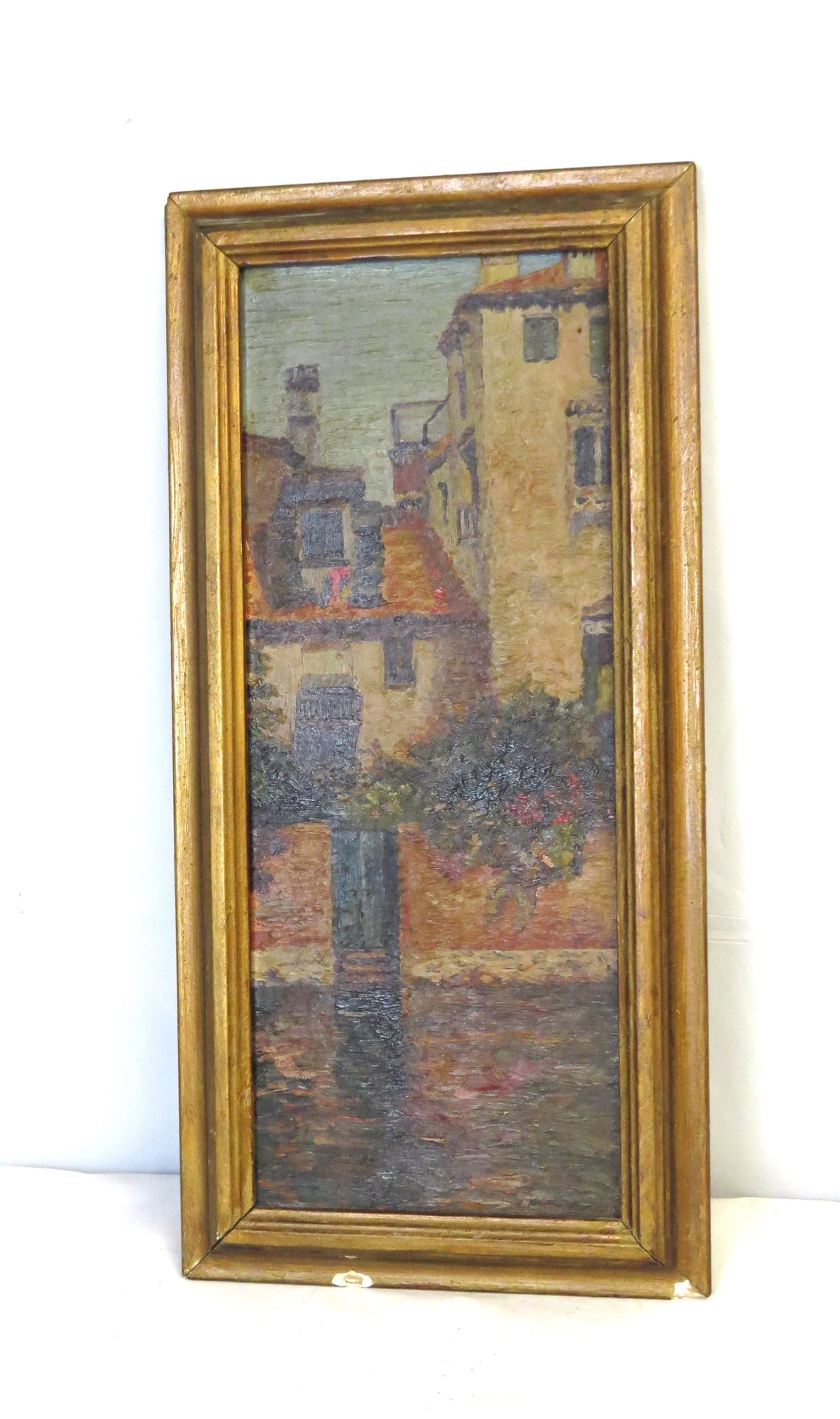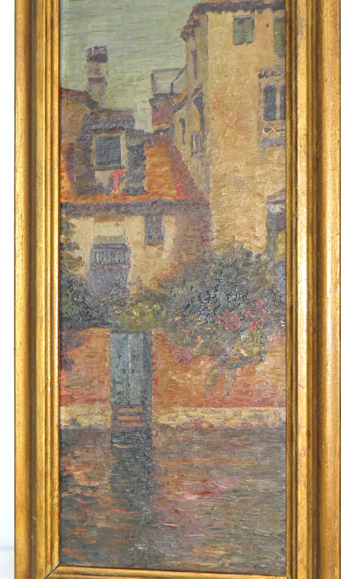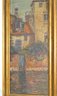 Oil on artist board, stucco homes behind wall and gardens, 12” x 5”
