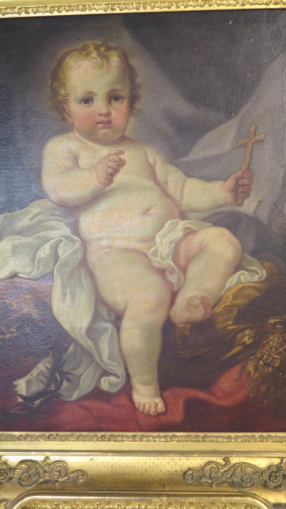 Old School style oil on canvas of the Christ Child, copy of F. Boucher 1774, frame has damage lower right, 24” x 19” see pics