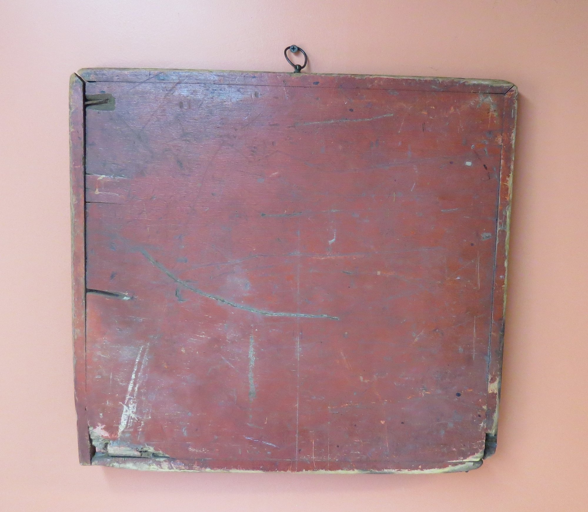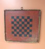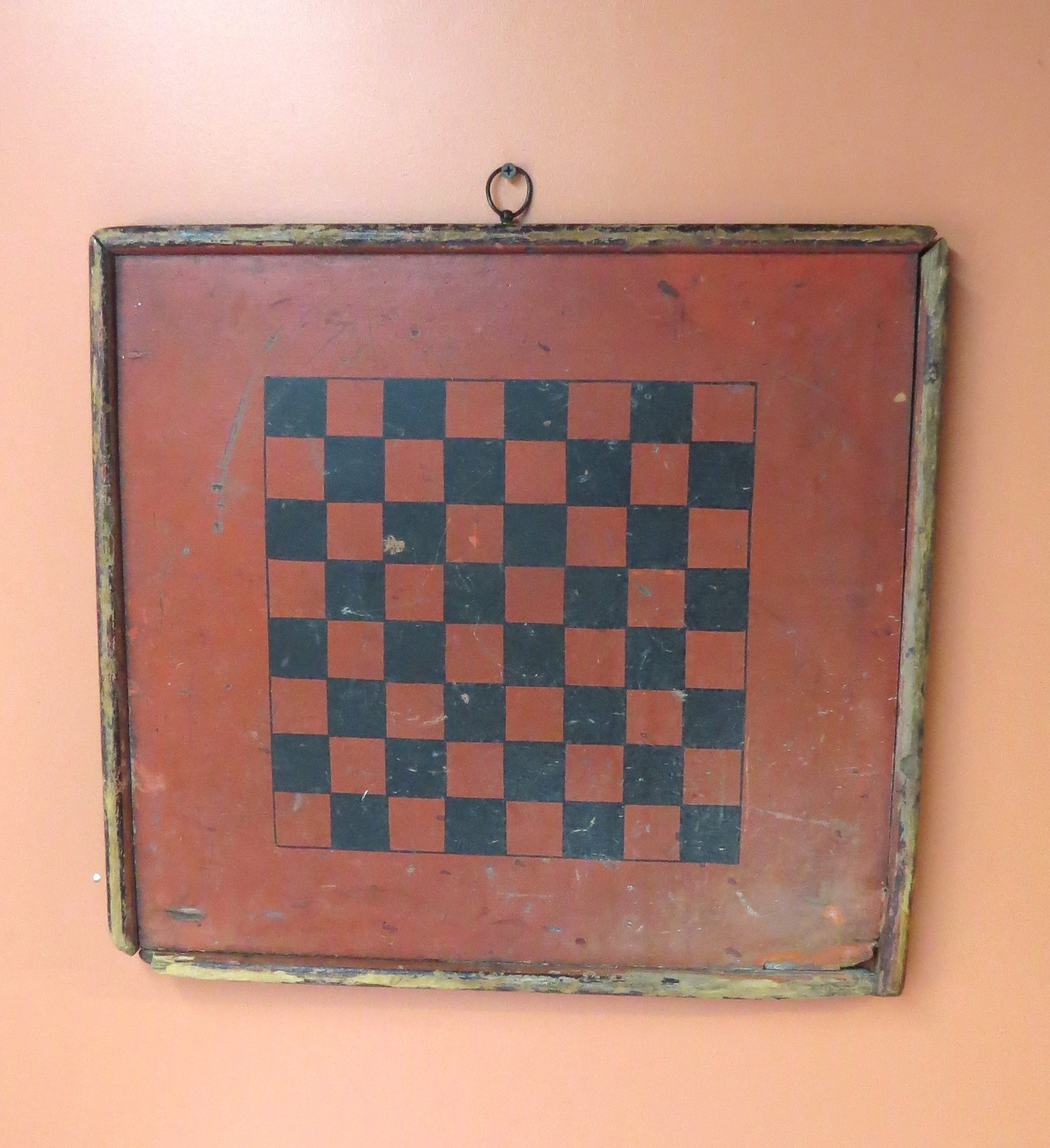 Red and black painted checkerboard, some roughness around border, 18” x 17”
