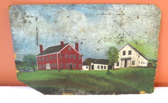 Notes: Primitive oil on board farmhouse and barn in rough condition, has some paint loss and two broken corners. 10” x 16”