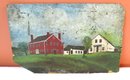 Primitive oil on board farmhouse and barn in rough condition, has some paint loss and two broken corners. 10” x 16”