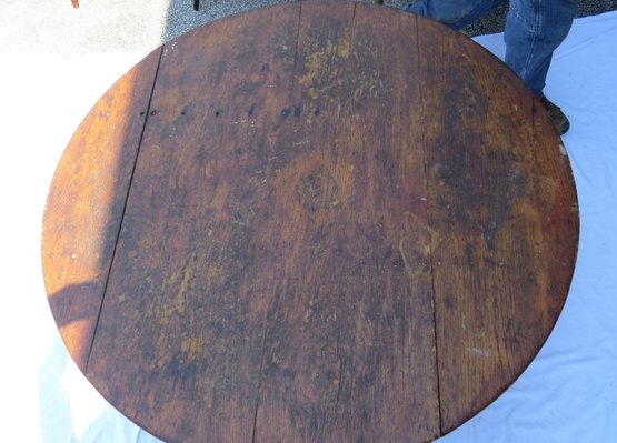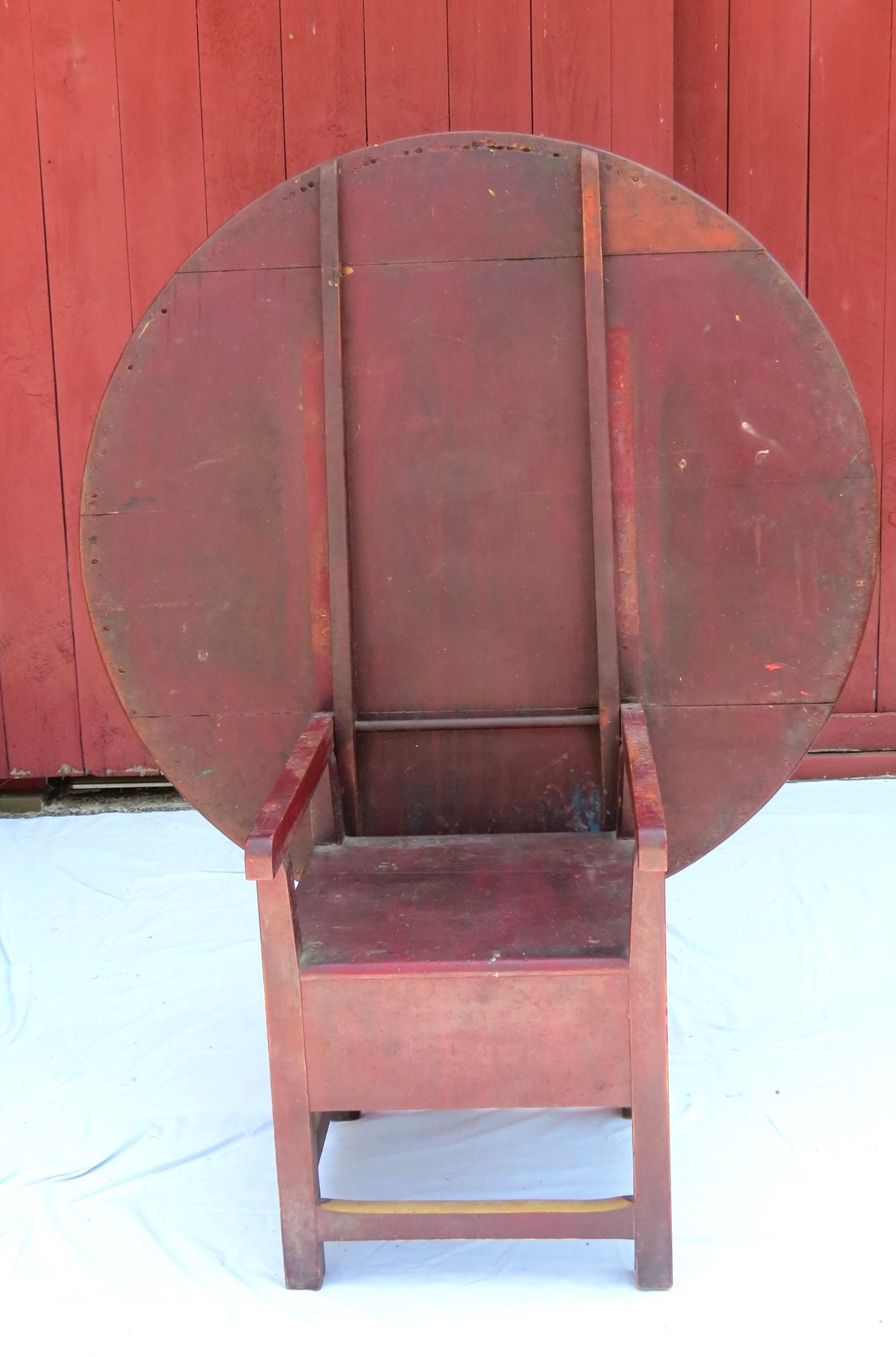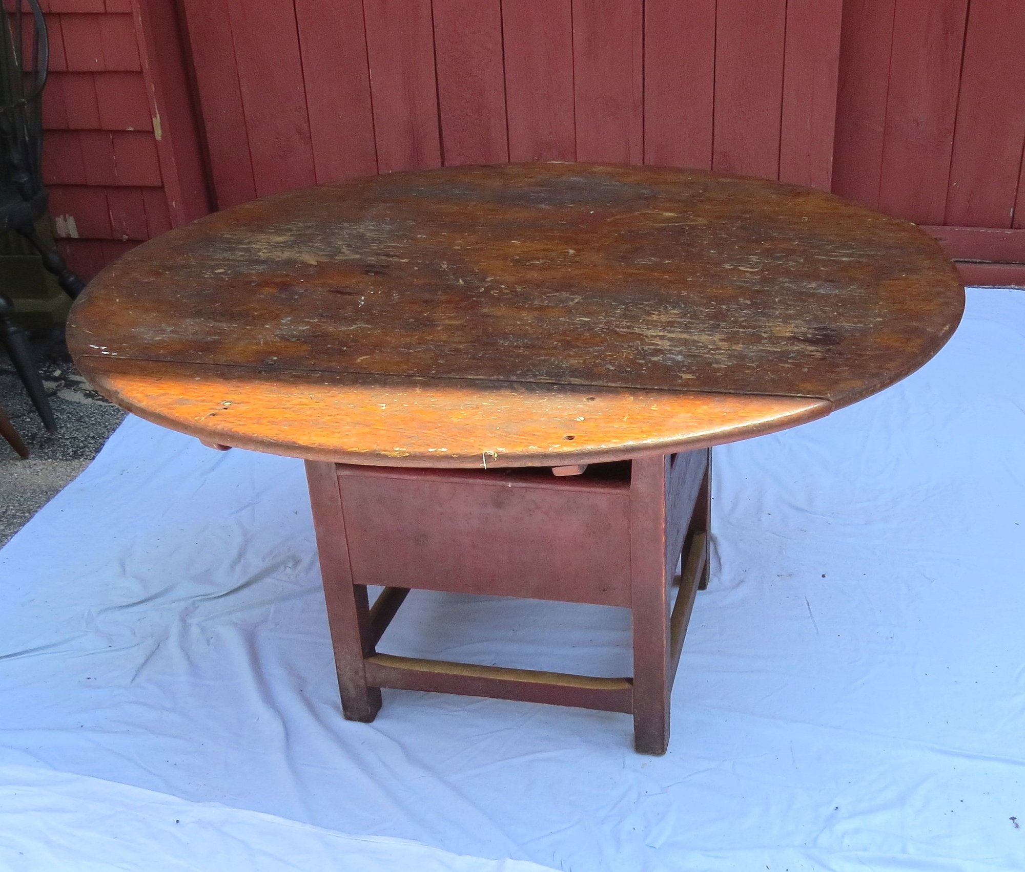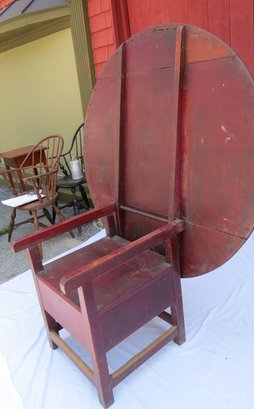Round top square leg Chair table in dry red paint and scrub top 48” diameter, seat height is 18”, table height is 26”, height with top up is 60” h. original condition, no repairs.
