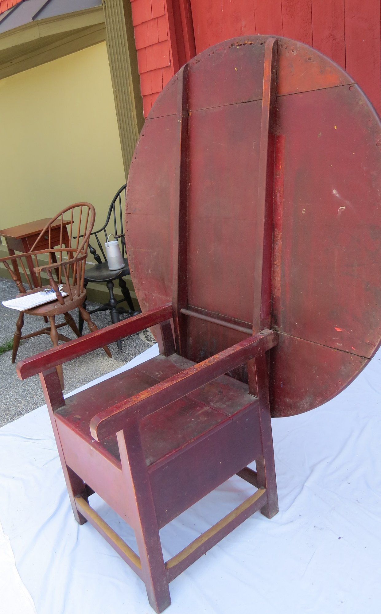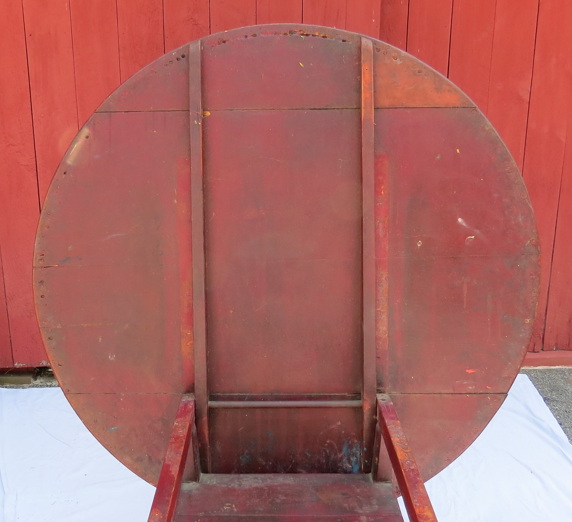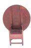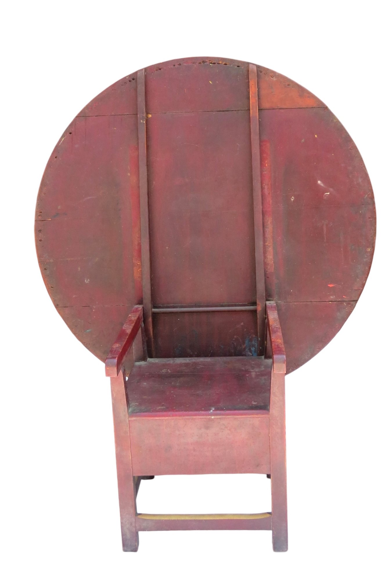 Round top square leg Chair table in dry red paint and scrub top 48” diameter, seat height is 18”, table height is 26”, height with top up is 60” h. original condition, no repairs.