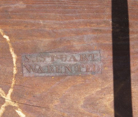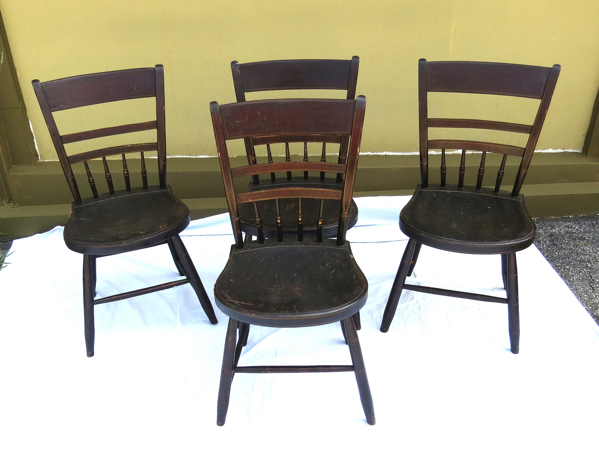 Set 4 thumb back Windsor chairs, 35” h. seat height 18”, signed S. Stuart branded under seat, one chair has a missing one side stretcher