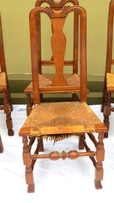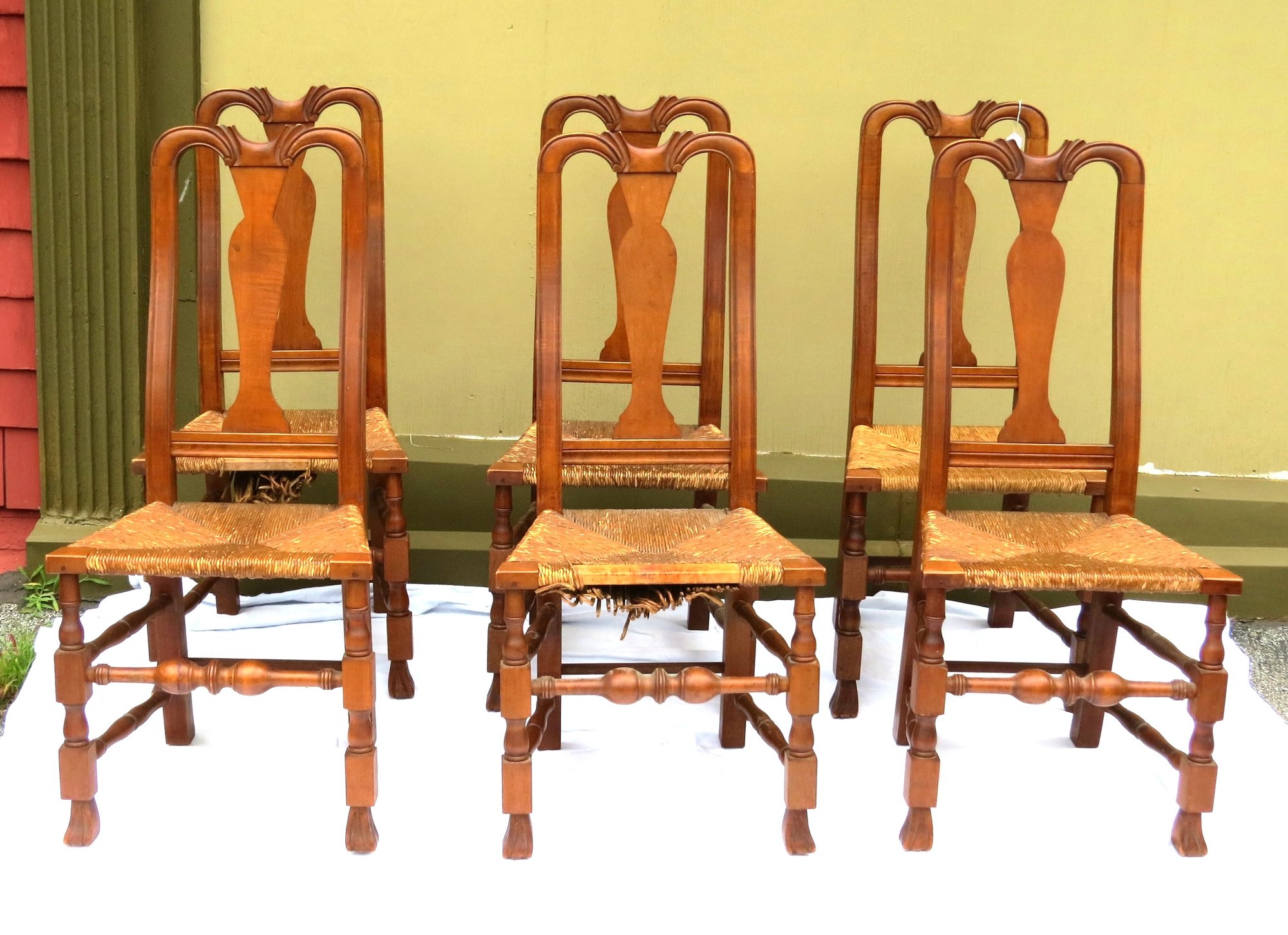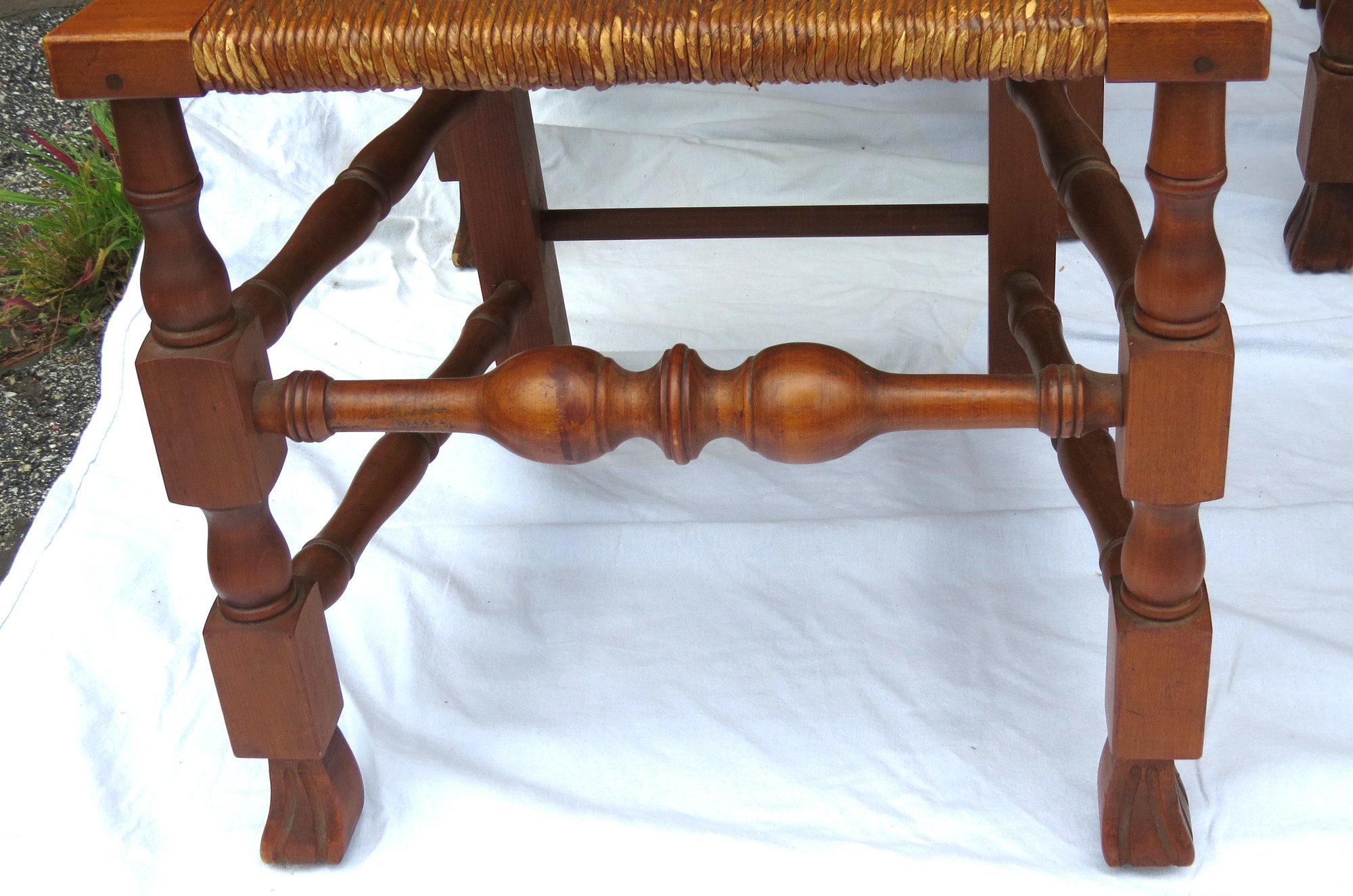 Set six custom made Spanish foot side chairs with rush seats, some seats need replacement.