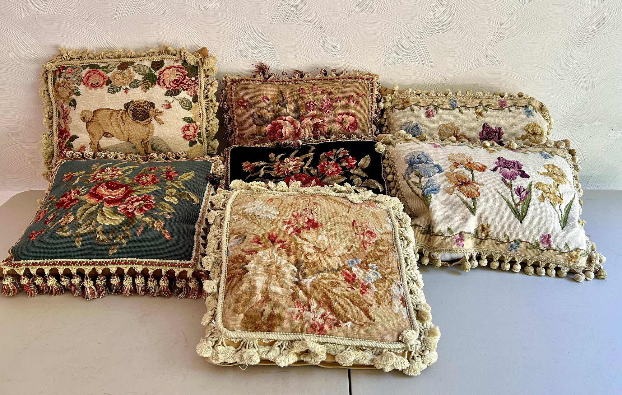 Seven Decorative Toss Pillows Some With Needlework