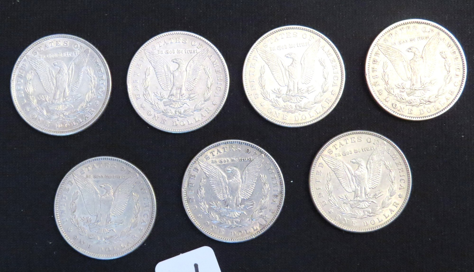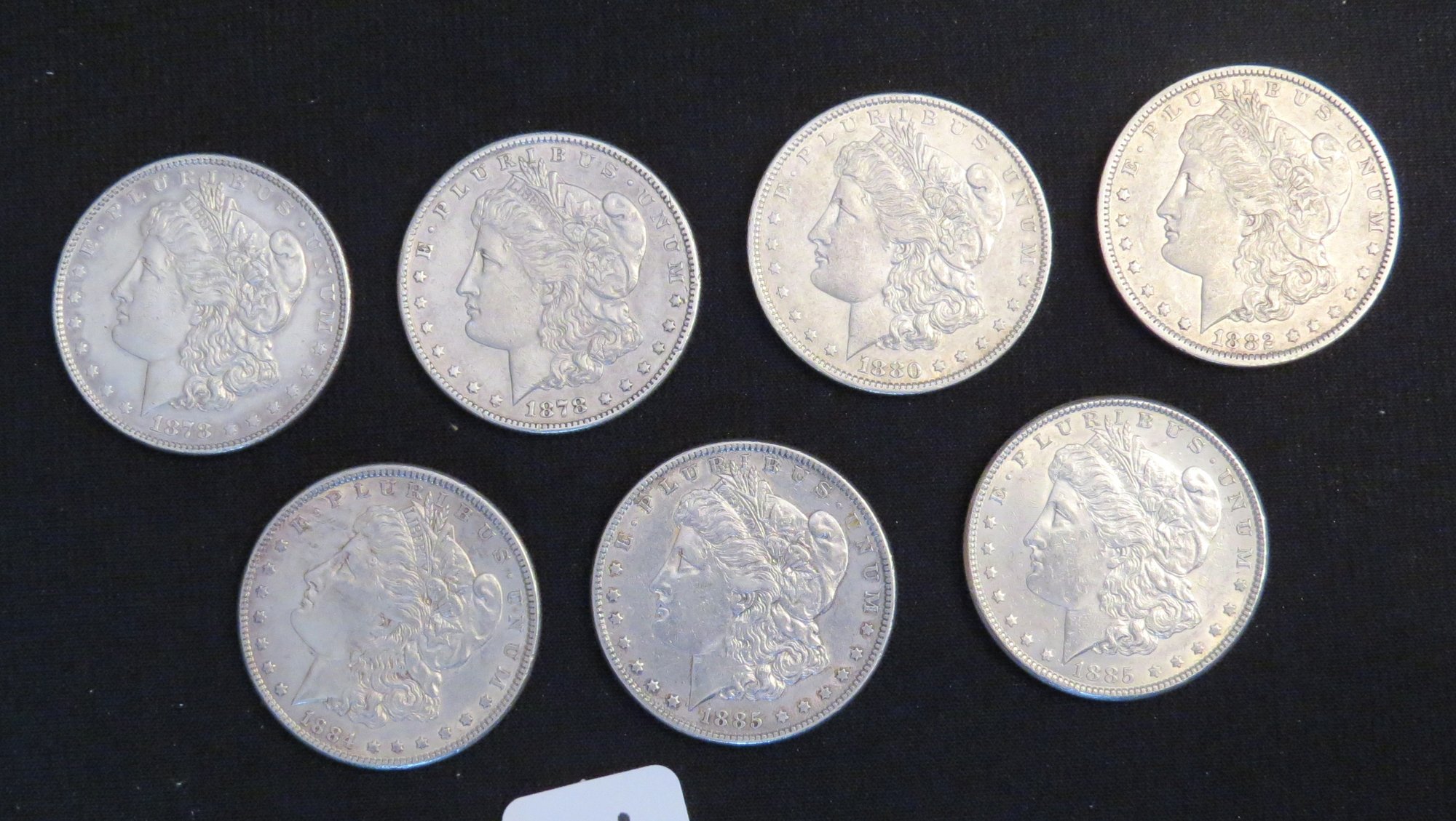 Seven Morgan Silver Dollars, 1878, 1878-S, 1880-O, 1882-O, 1884, 1885, 1885