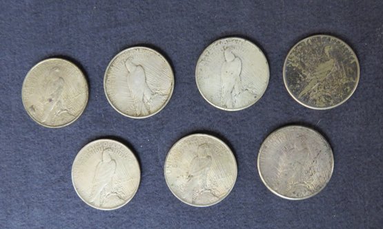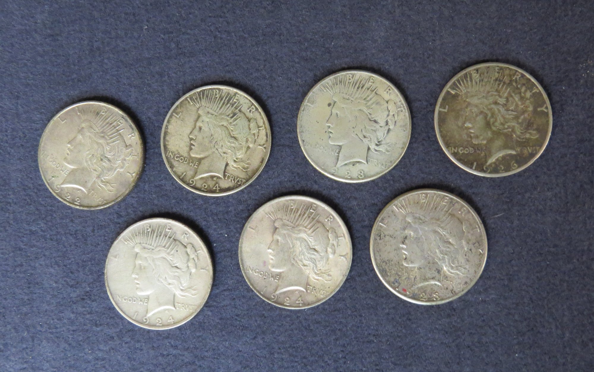 Lot of 7 Peace dollars, 1922D, 1924, 1923-S, 1926-S, 1924, 1924, 1923-S