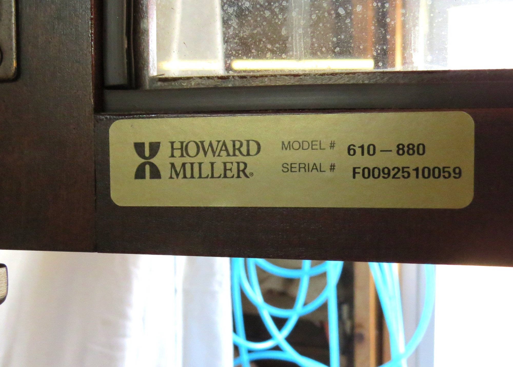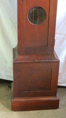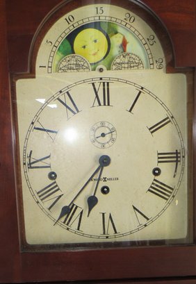 Shaker style Howard Miller grandfather clock, time and strike movement with brass weights and key, model 610-880 good condition, never tried to run it, 6’ 8” h.
