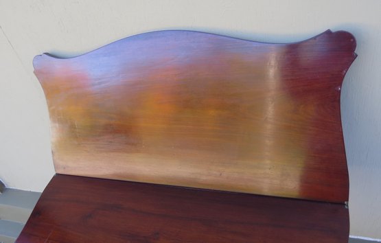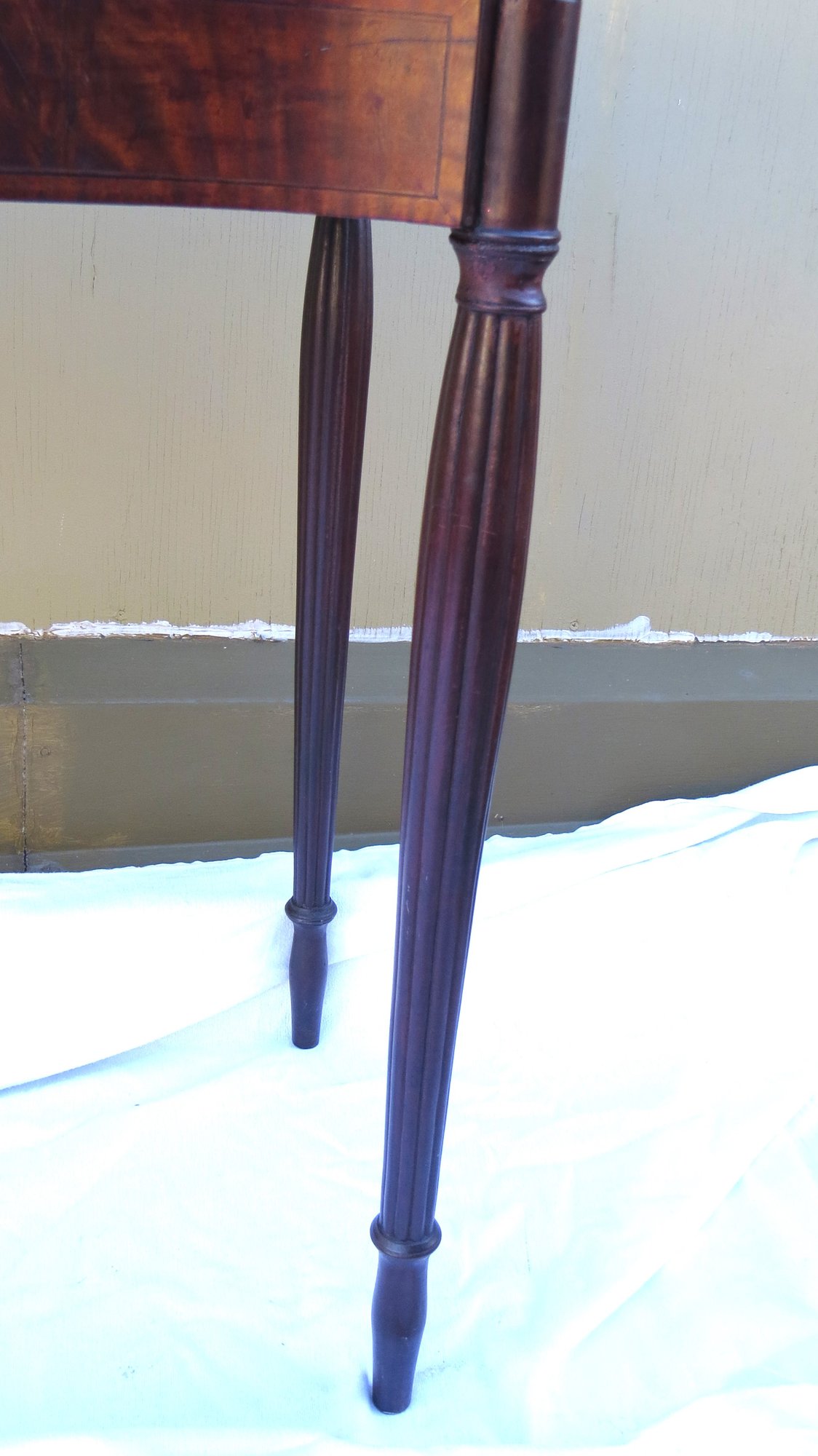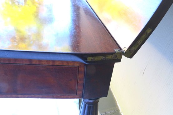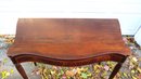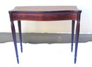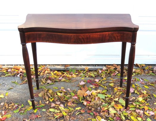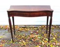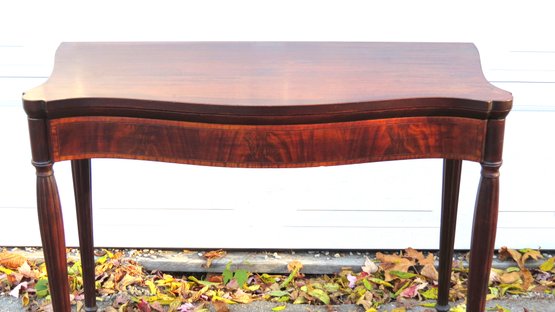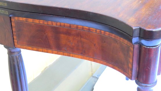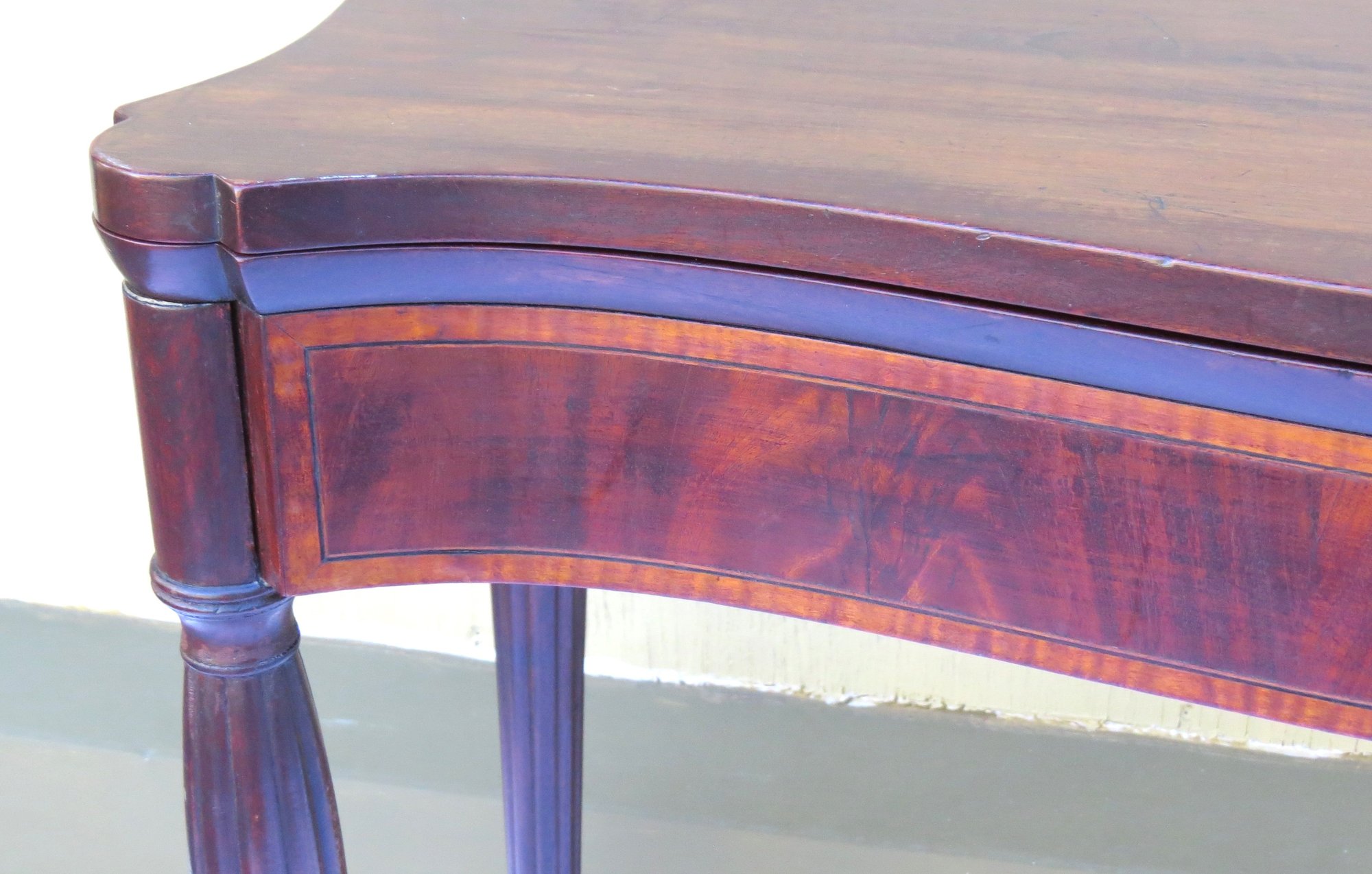 Sheraton inlaid mahogany card table with serpentine top and cookie corners, slender bulbous reeded legs, 35 1/4" w. x 17" d. x 30 1/4" h.