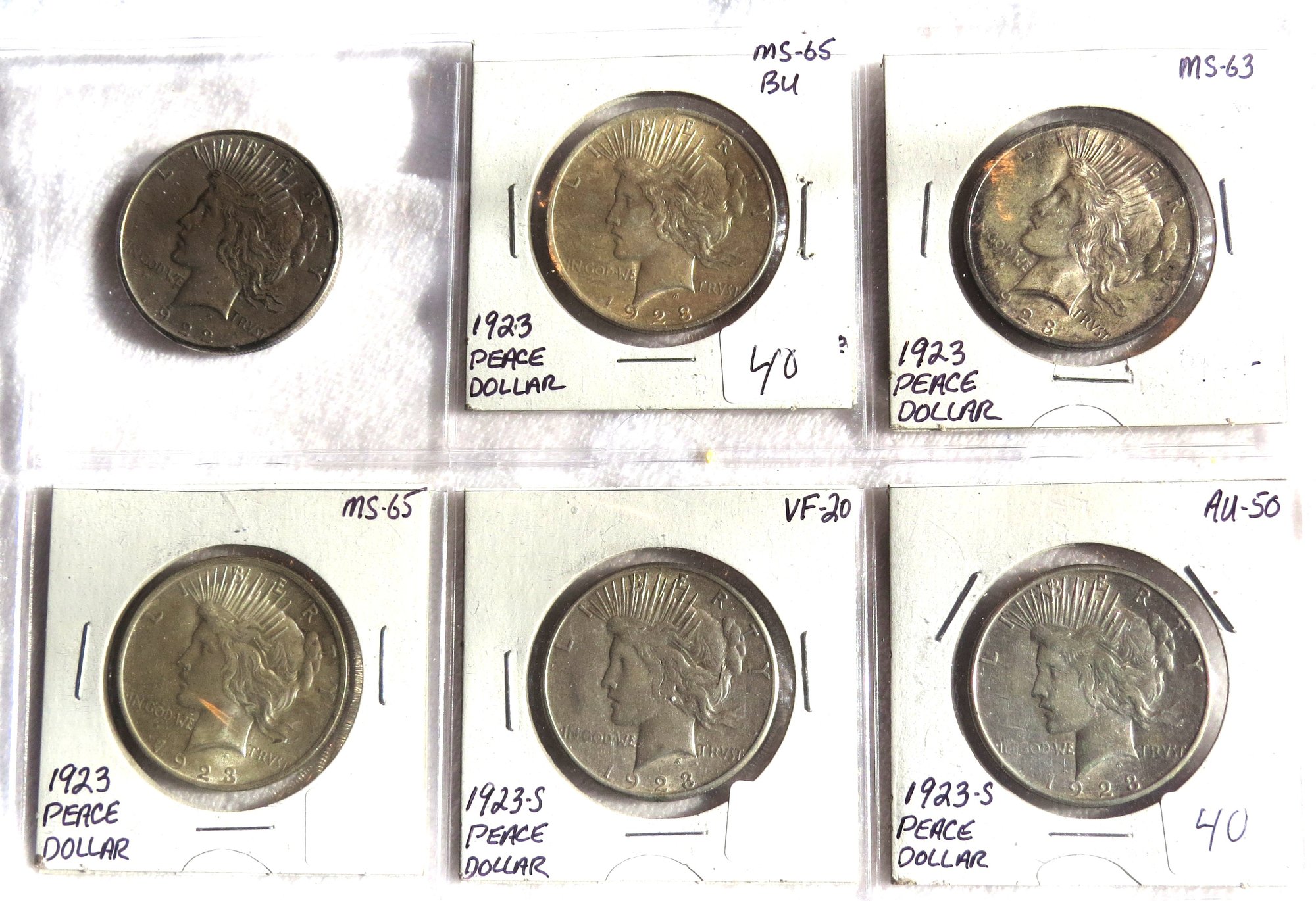 Six Peace Dollars, 1922, 1923, 1923, 1923, 1923-S, 1923-S