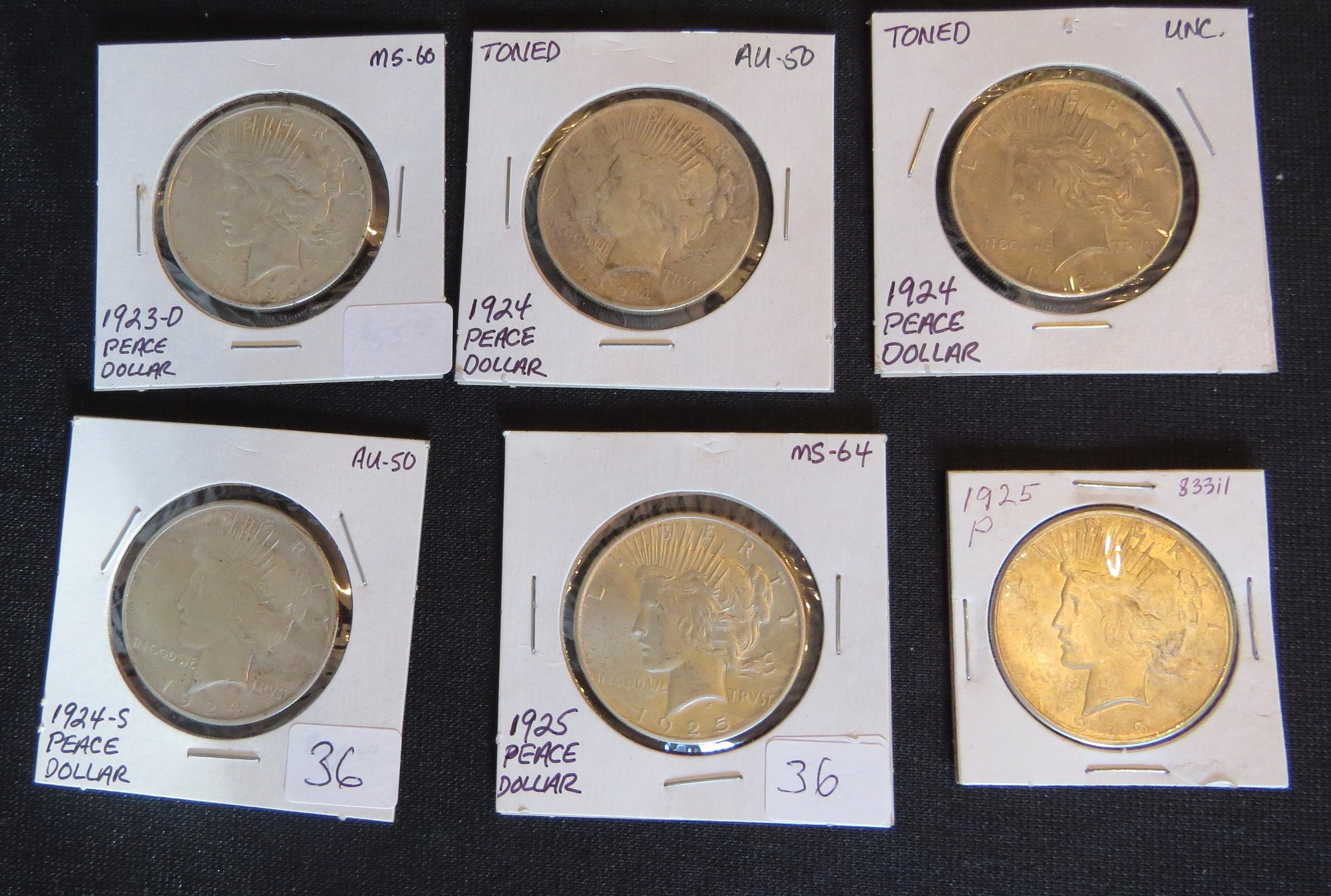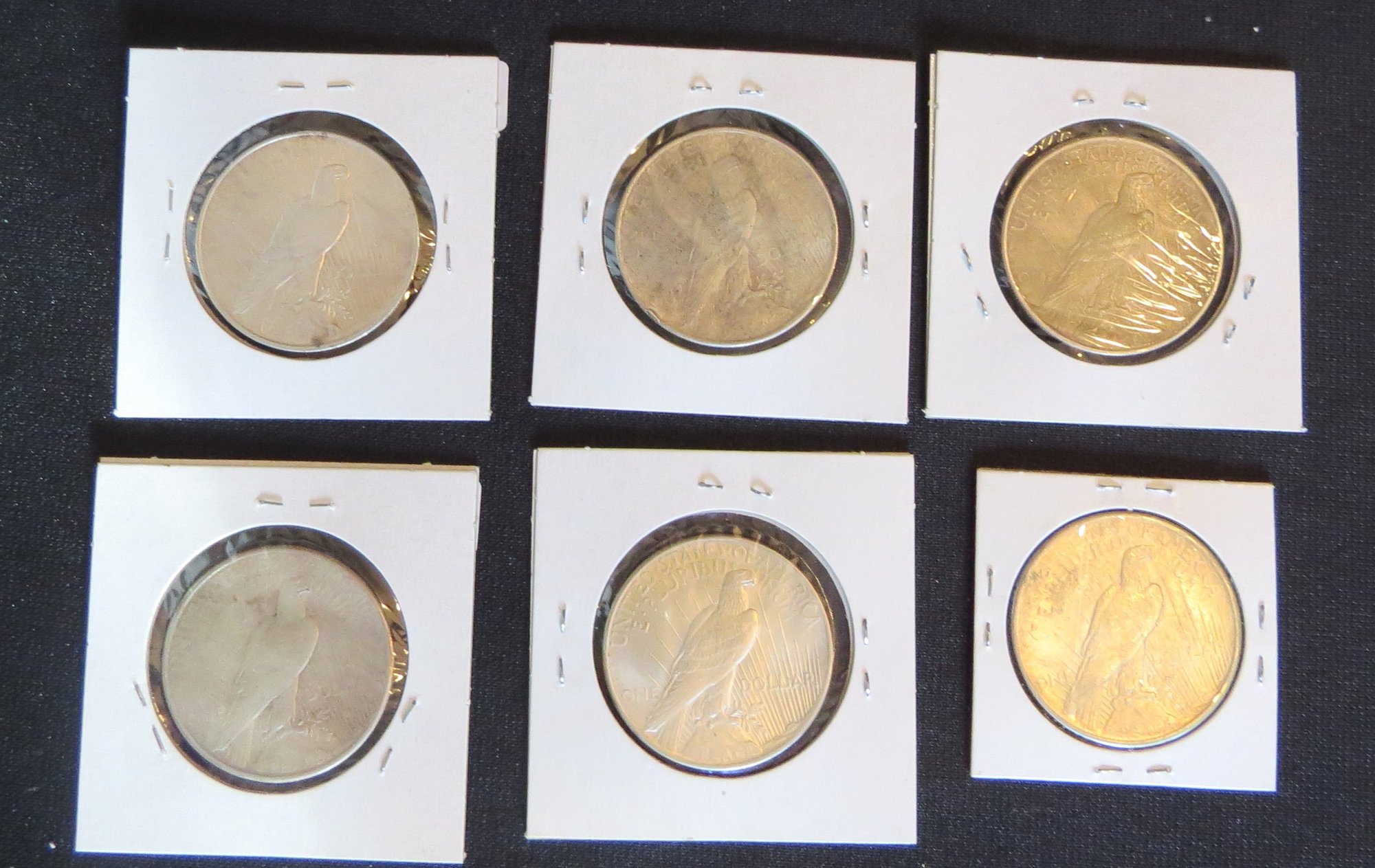 Six Peace Silver Dollars, 1923-D, 1924, 1924, 1924-S, 1926, 1925
