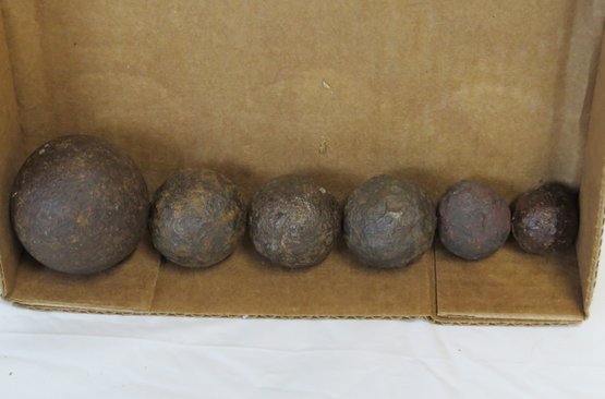 Six various size cannon balls which appear to be dug up, 2” to 1”