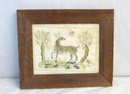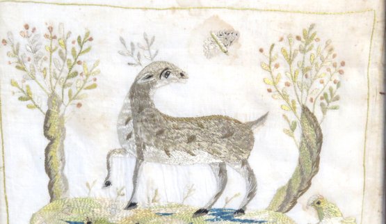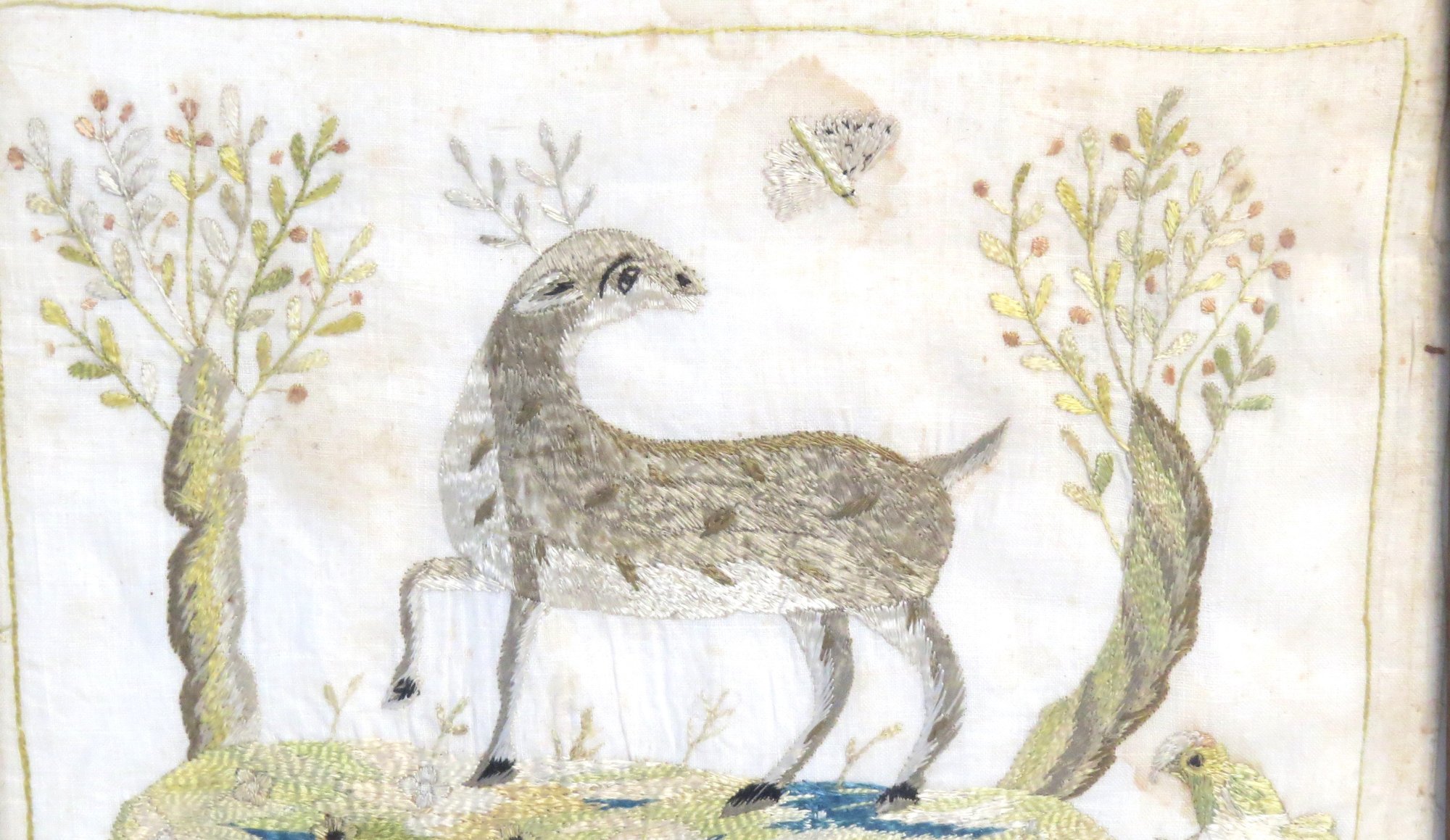 Small silk 18th Cent. needlework of deer between trees with butterfly and bird, 7” x 9” sight