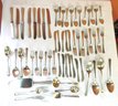 Sterling silver flatware set consisting of 12 tea spoons, 6 salad forks, 8 dinner forks, 4 table spoons, 4 serving spoons, 1 ladle, 1 small serving spoon, salad serving fork, 12 butter knives, odd spreading knife, 1 cake knife with stainless blade sterling handle, 8 dinner knives with sterling handles. Weight not including cake knife or dinner knives is 929.37 dwt or 46.46 troy oz.