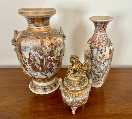 Three Satsuma Pcs - 2 Vases And Other Piece With Mismatched Cover