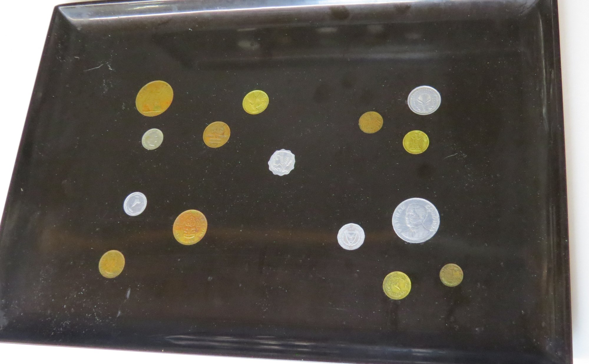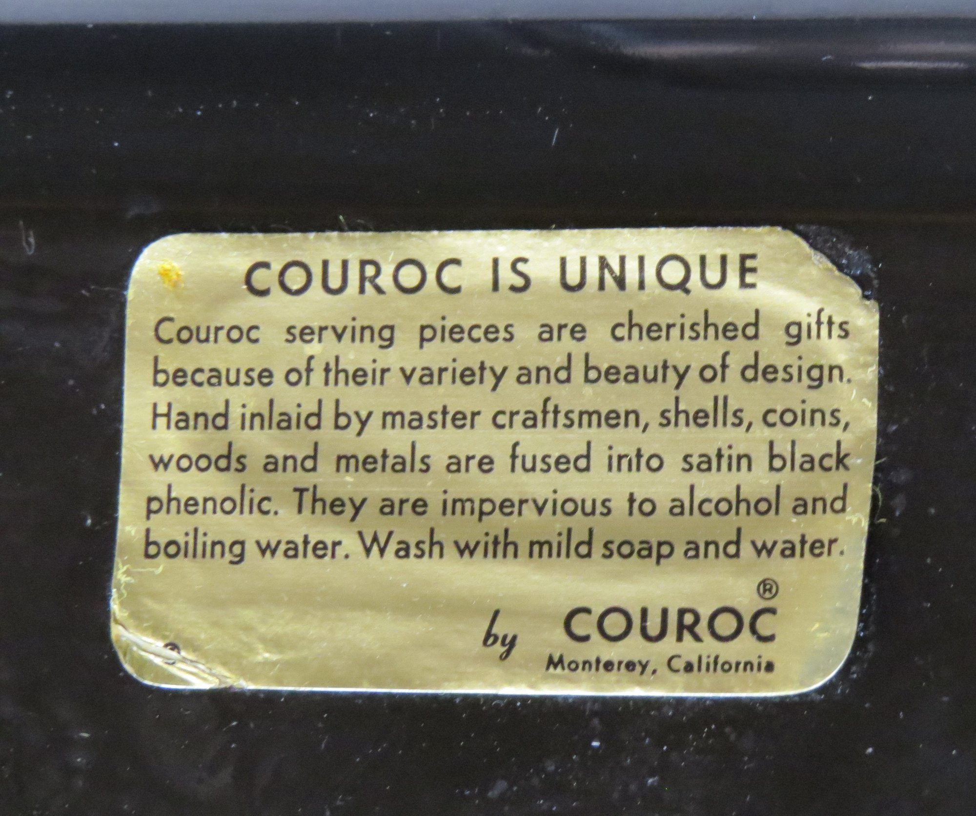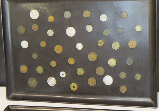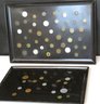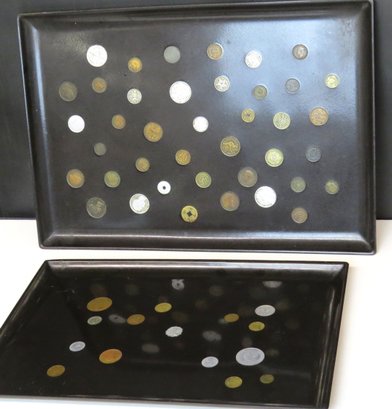 Two trays with inlaid foreign coins made by Couroc, Monterey CA