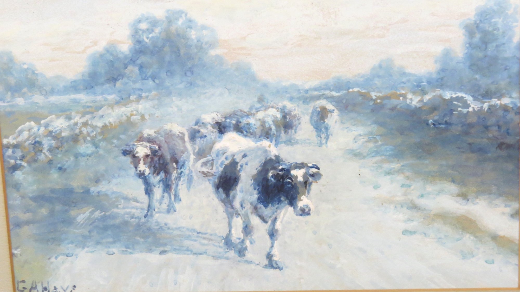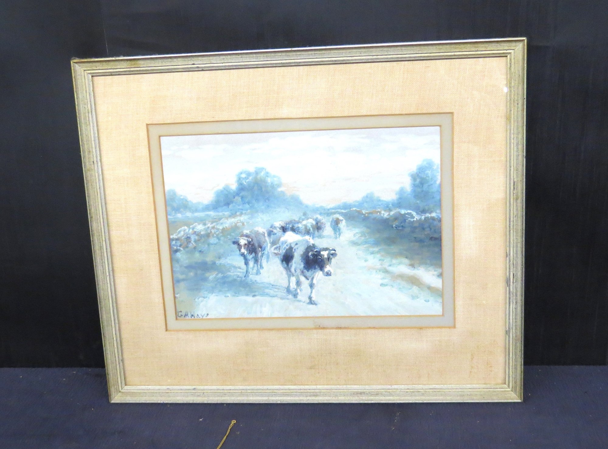 Watercolor “Cows coming Home” signed G. A. Hays, 9” x 13” sight, 17” x 20” frame