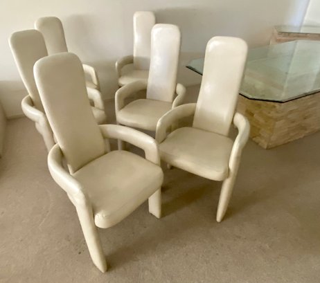 CUSTOM ARMCHAIRS- SIX IDENTICAL. SLIGHT SIGNS OF WEAR TO LEATHER, NEEDS A GOOD CLEANING, FREE OR RIPS OR MISSING PARTS. VERY SOILD !