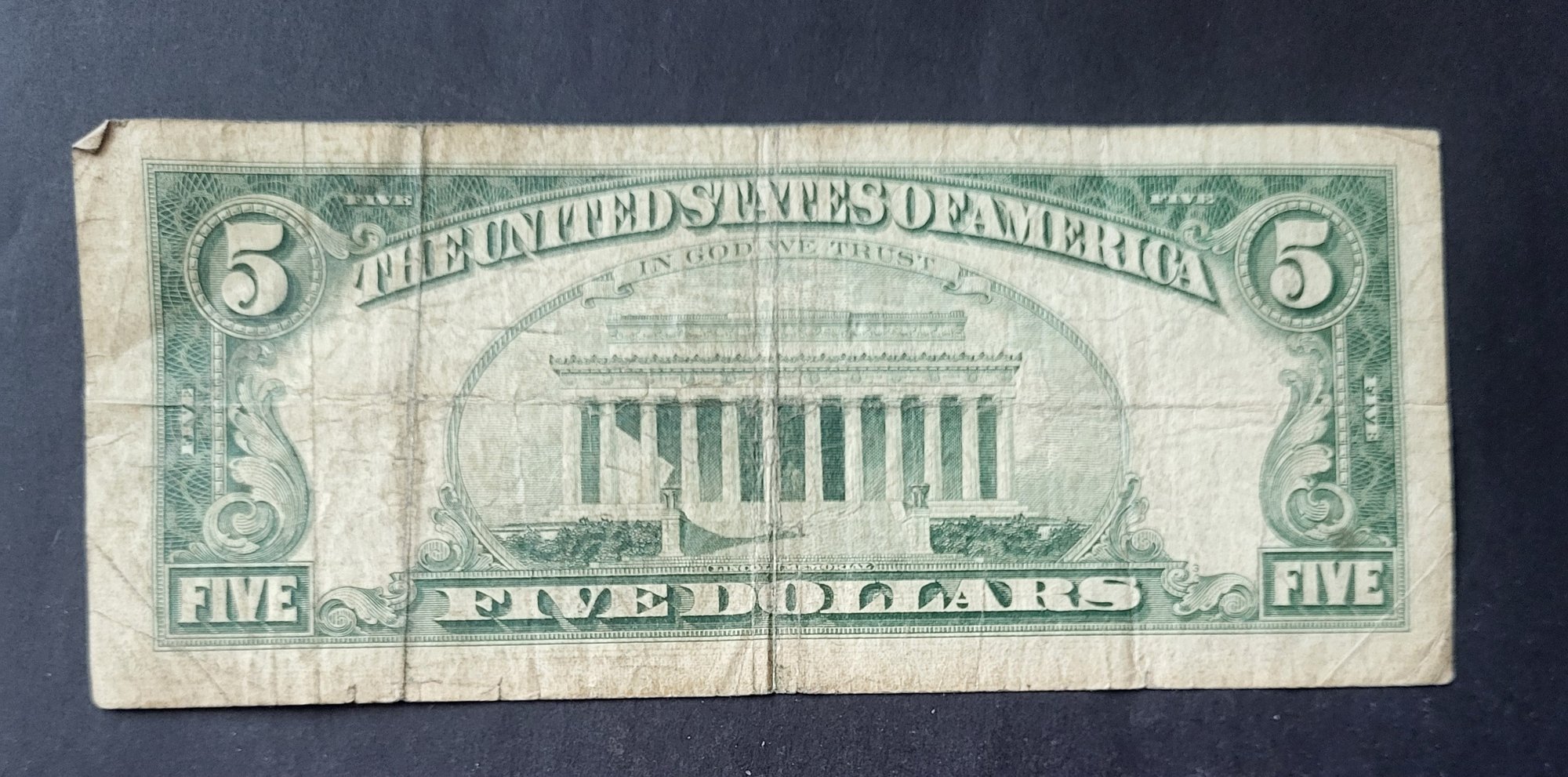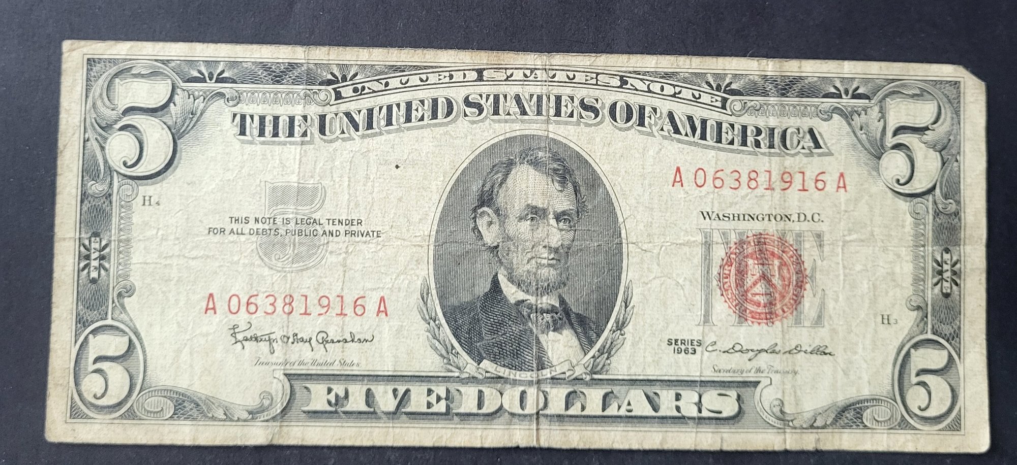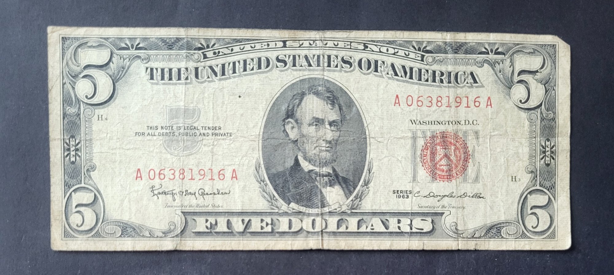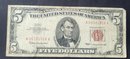 U.S. UNITED STATES NOTE--FIVE DOLLARS--RED SEAL--1963