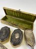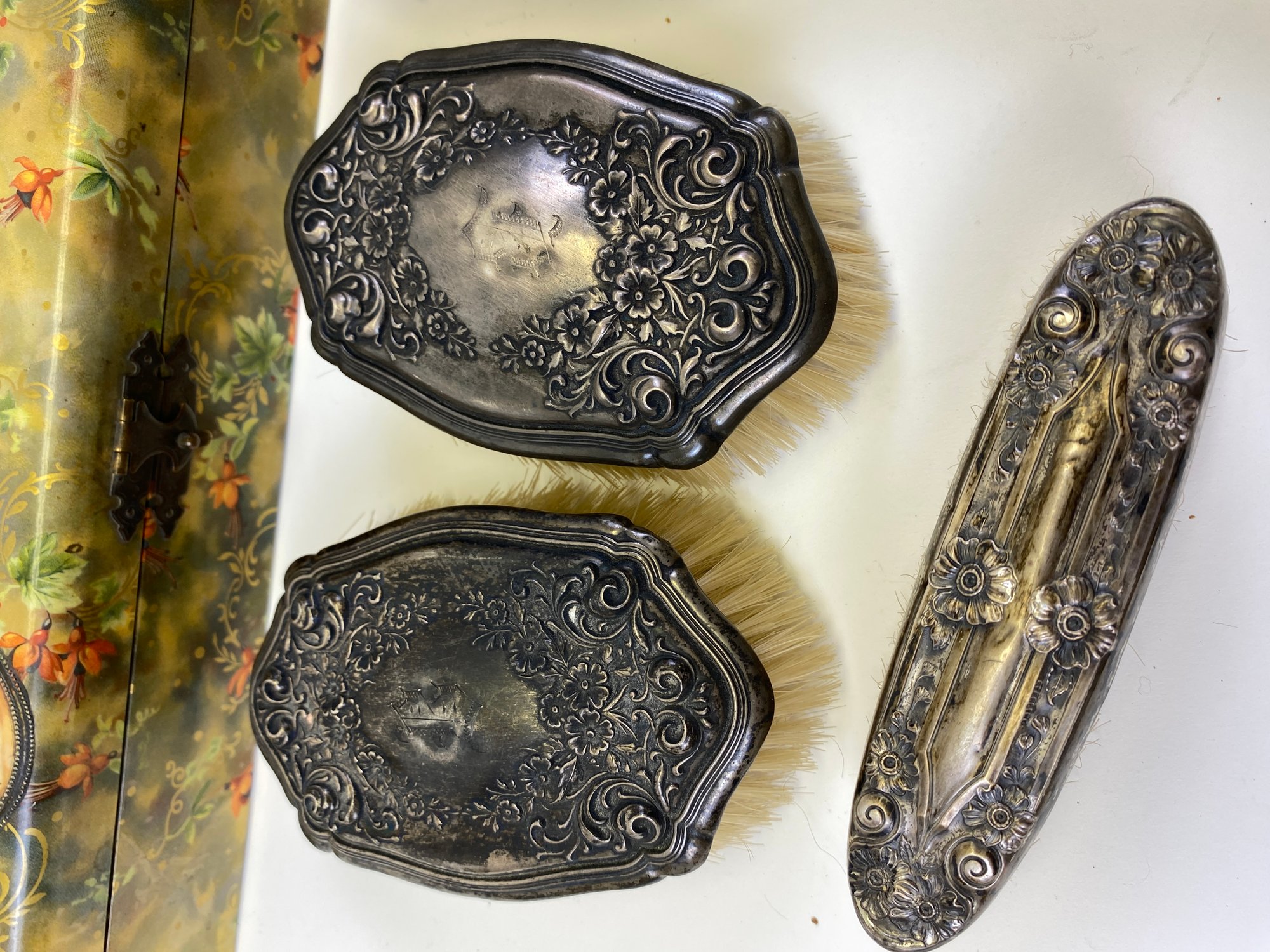 All brushes are in good condition and are marked "Sterling". The case has some damage to the finish, but is in solid condition. The largest brush is 9-3/8" long.