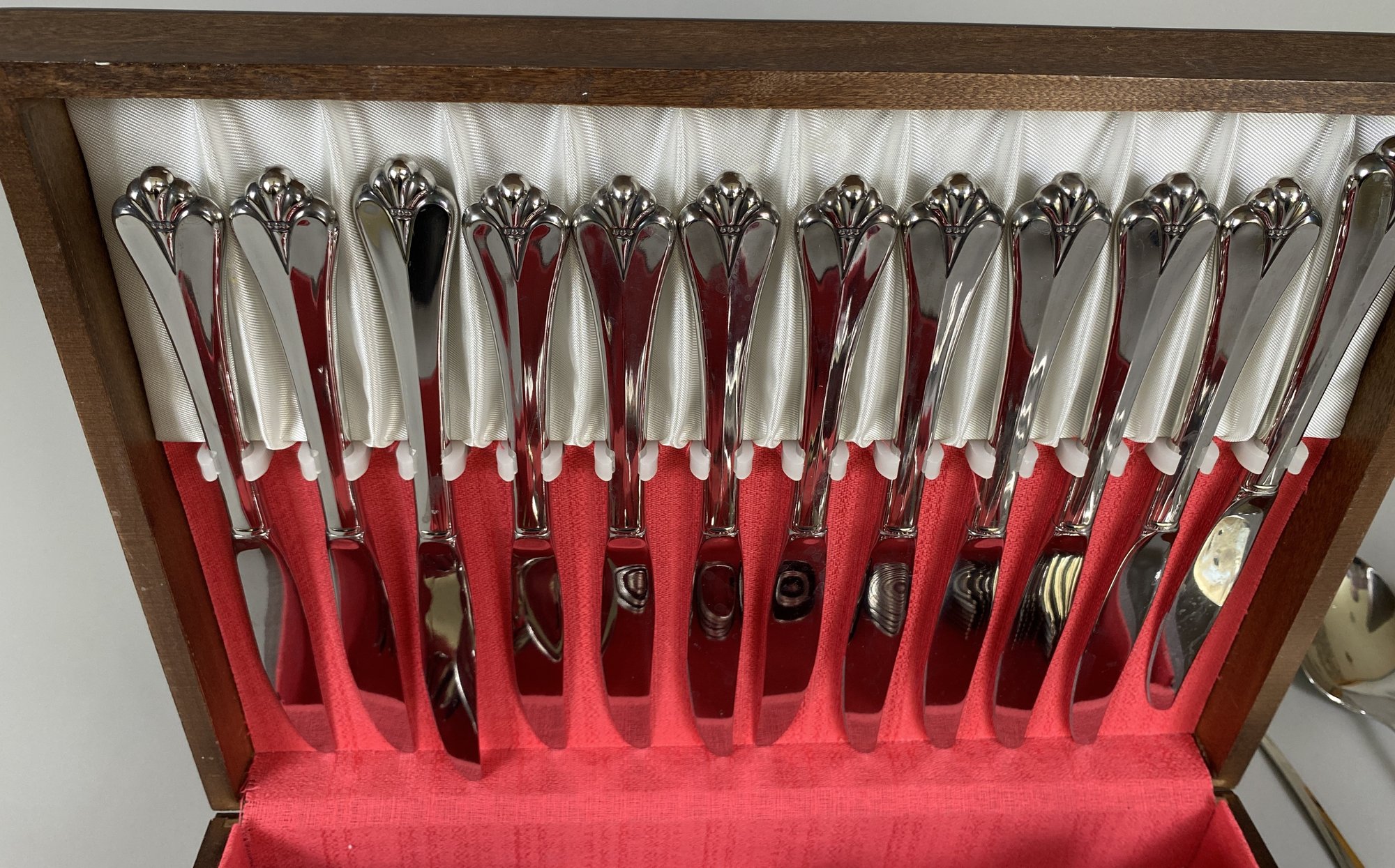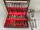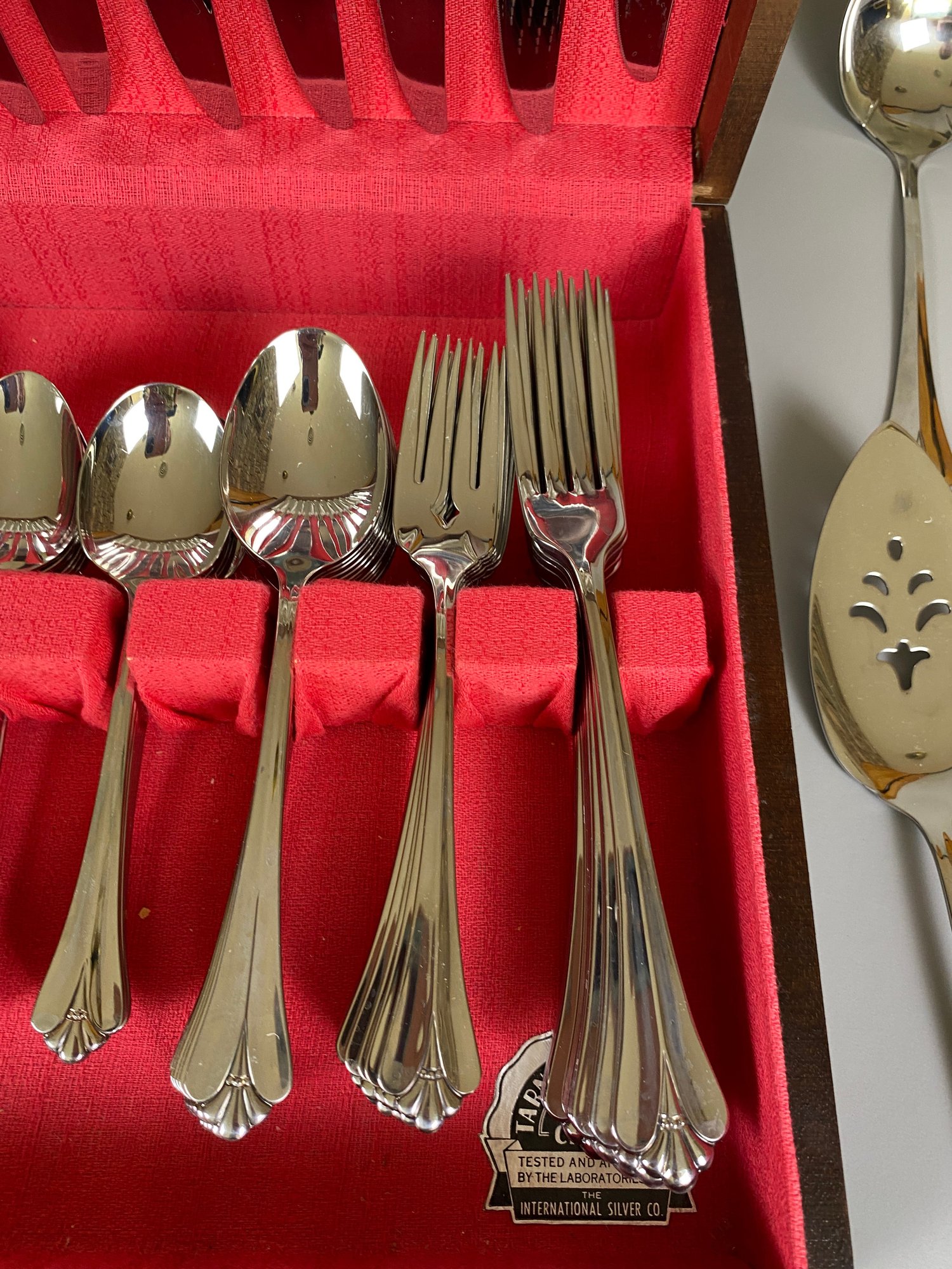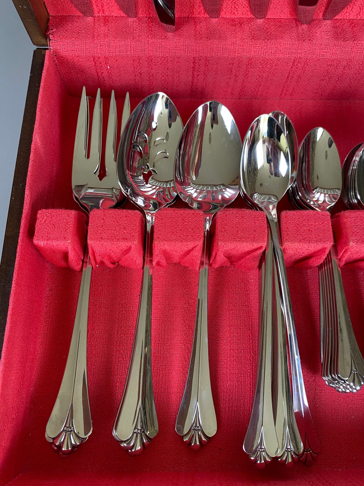 The silverware is in very good condition with little to no signs of wear. There are 12 knives, dinner and salad forks and ice tea spoons, 7 teaspoons , 8 soup spoons and many extra serving pieces.