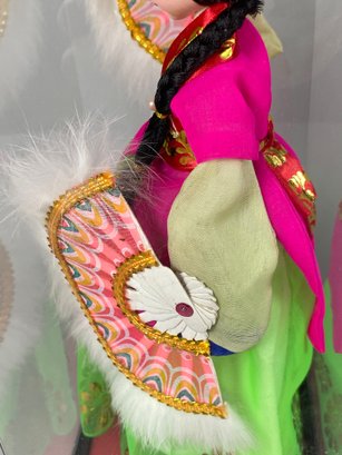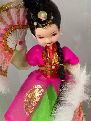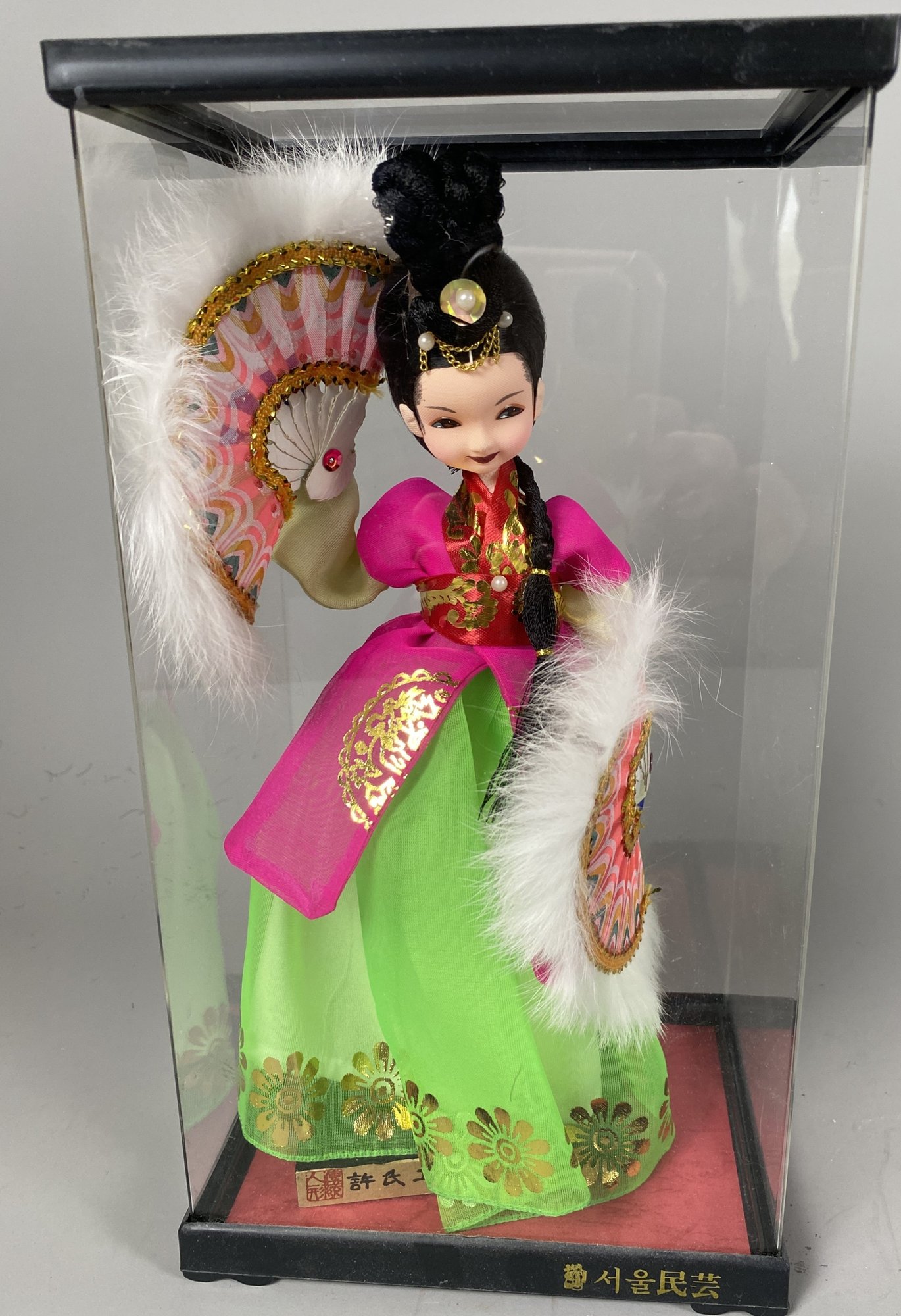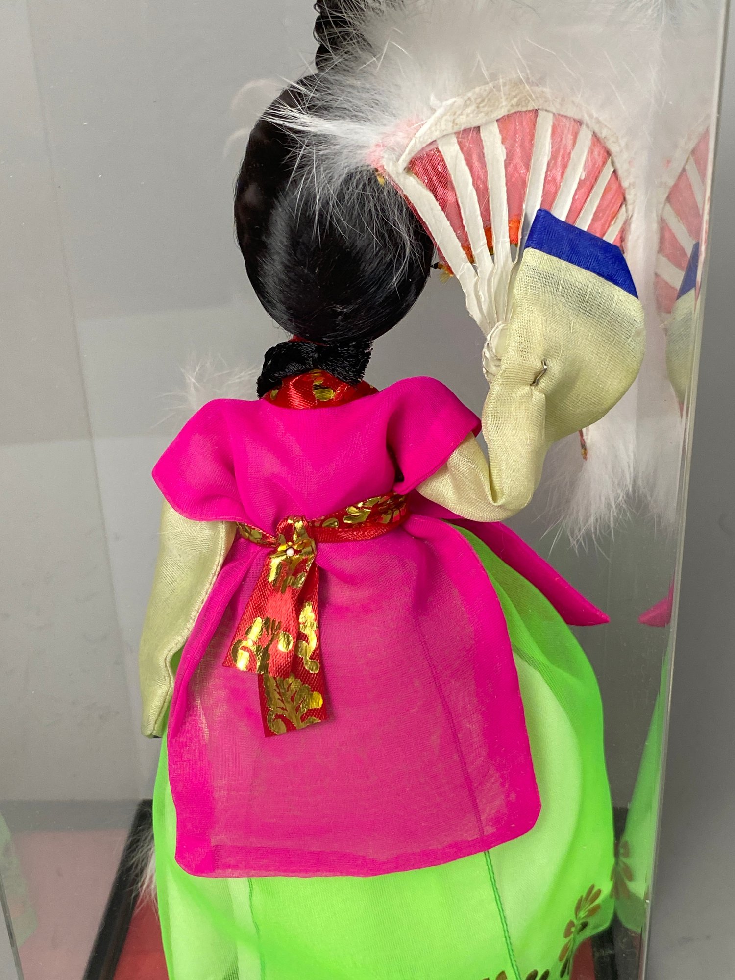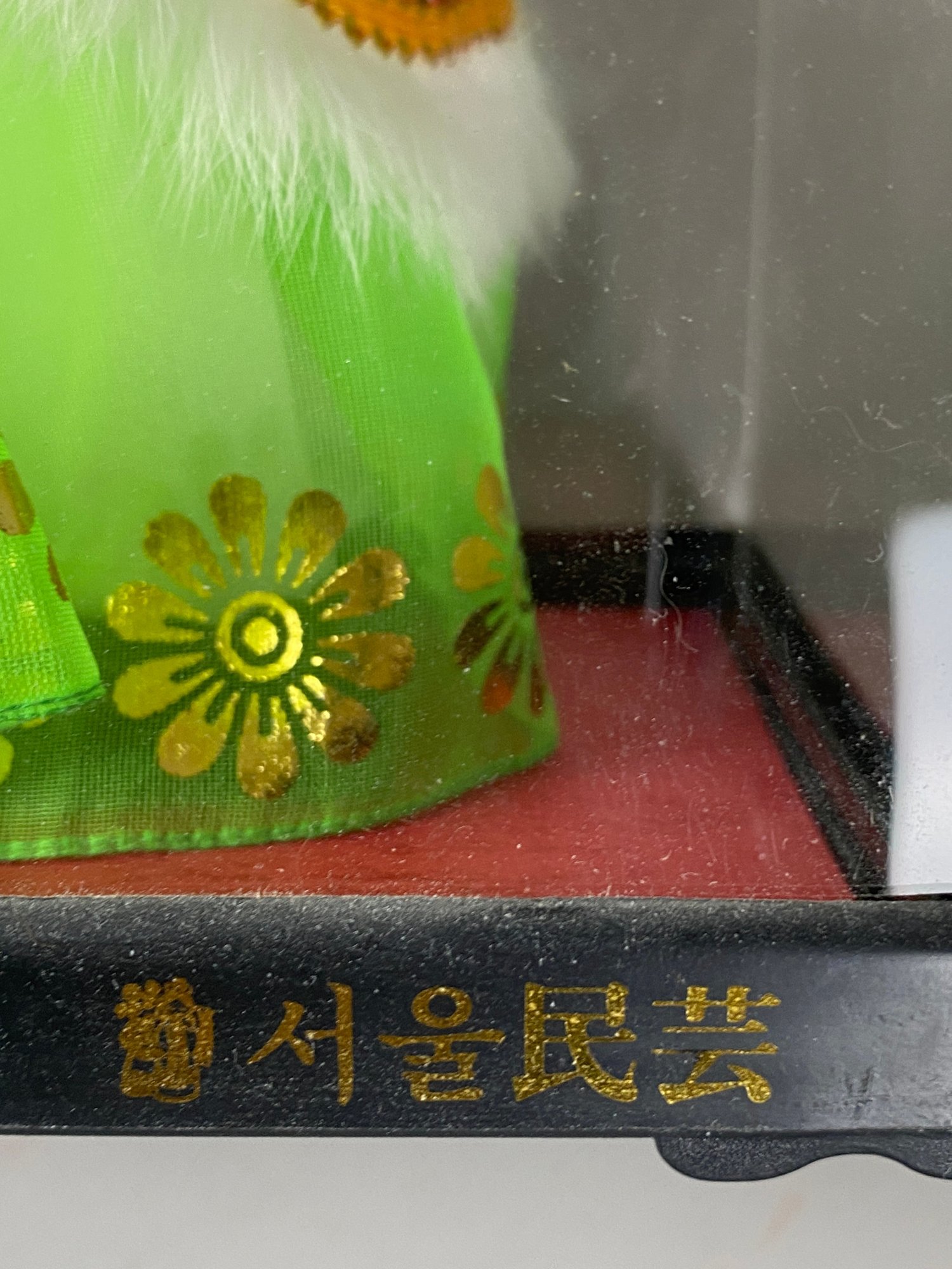 The doll are in very good condition with vibrant colors. The case is plastic and measures 6-1/6" wide x 4-3/4" deep x 11-1/2" tall. The words on the case translate to 'Seoul Folk Art.'