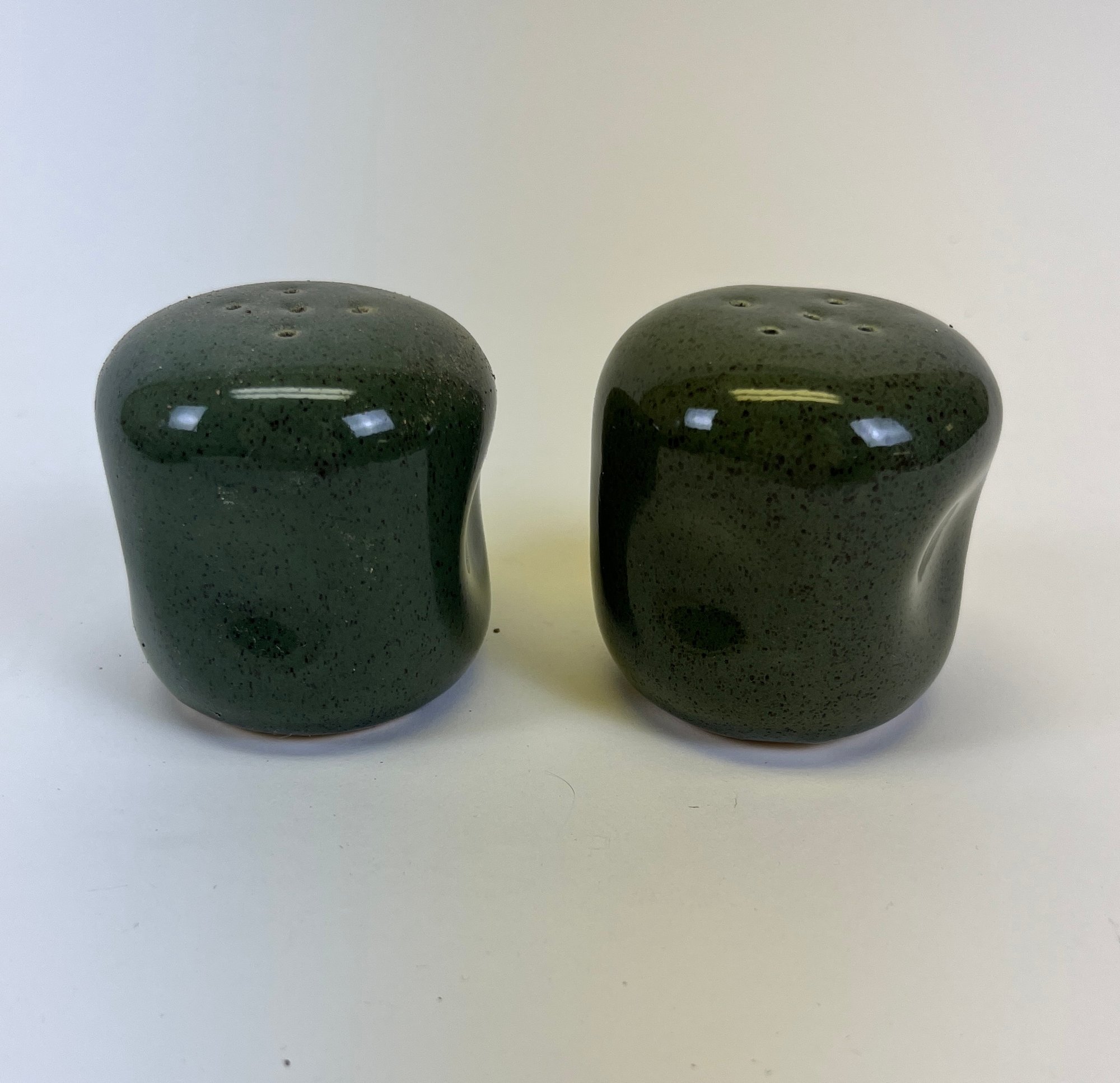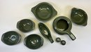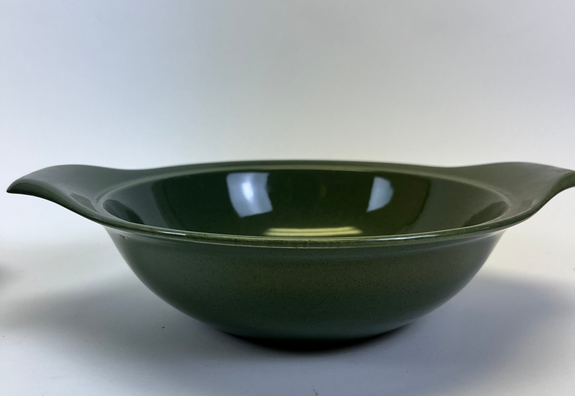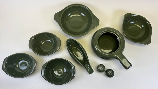 This lot includes salt and pepper shakers, a serving pot with missing lid, two stacking serving bowls, one gravy boat, and three smaller serving bowls. The largest bowl is 12" across and the smaller bowls are 8" across. The serving pot is missing its lid. Otherwise, these are in great condition.