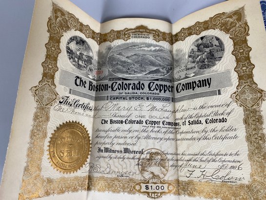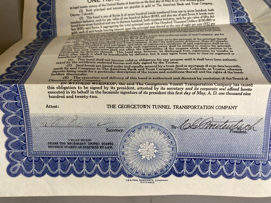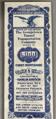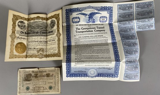 Georgetown Tunnel Transportation Company Bond is dated 1906. The Boston Colorado Copper Company Bond is dated May 1932 and the 1000 German Mark is dated April 1910.