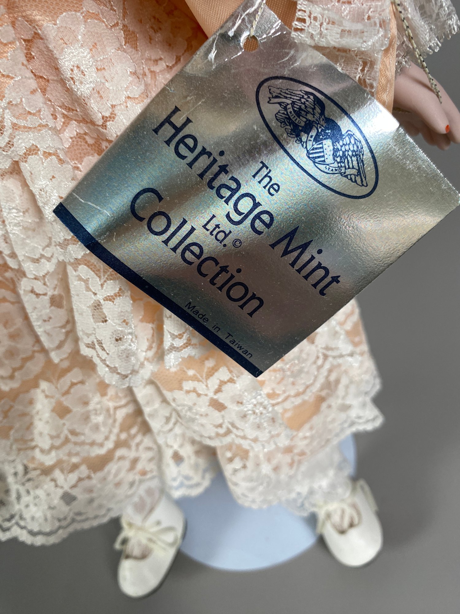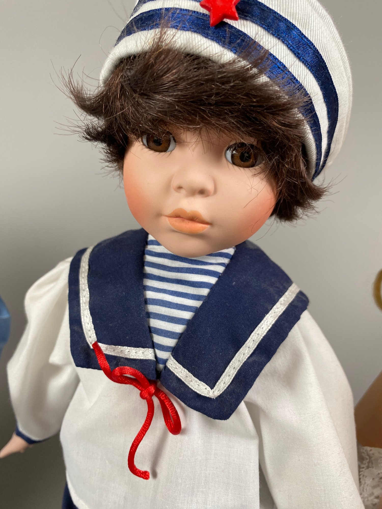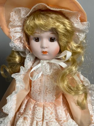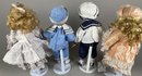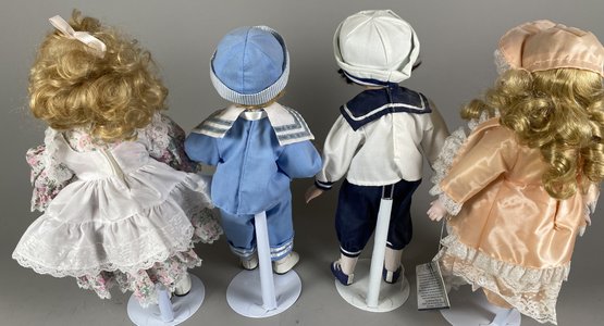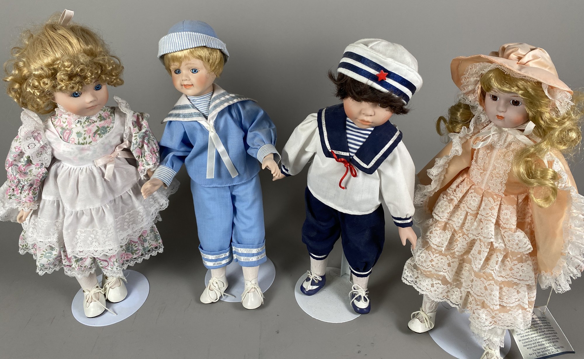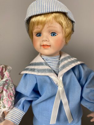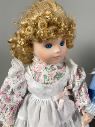 The dolls are in very good condition, although they need a bit of light dusting. They are approximately 15" to 16" tall. All have doll stands. The sailor doll is Conner from Collectible Memories and the doll in peach appears to be Rebecca by Heritage Mint.