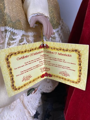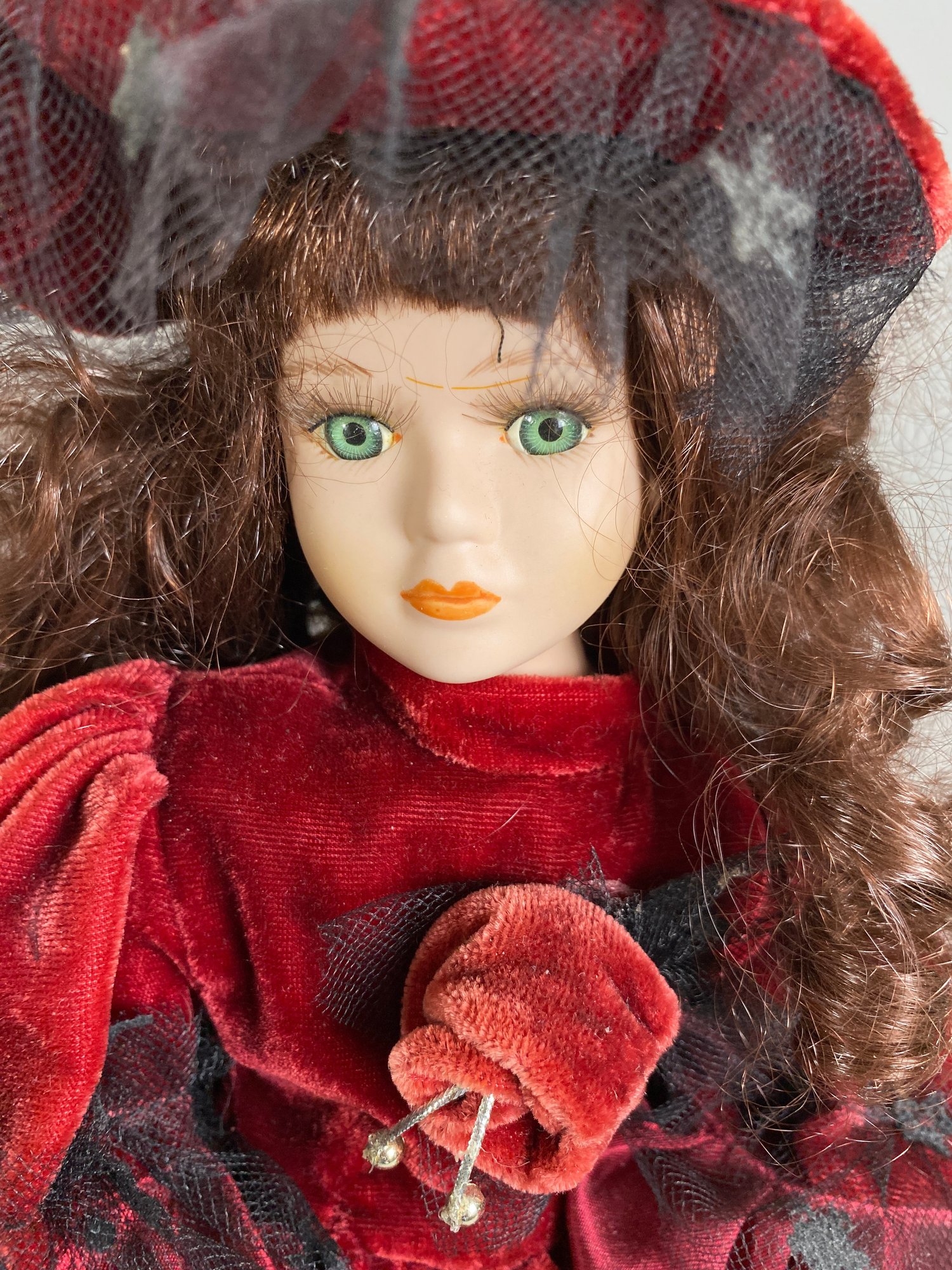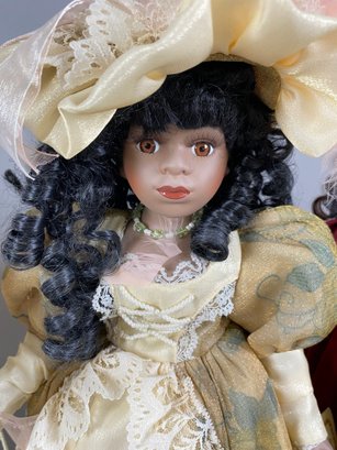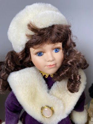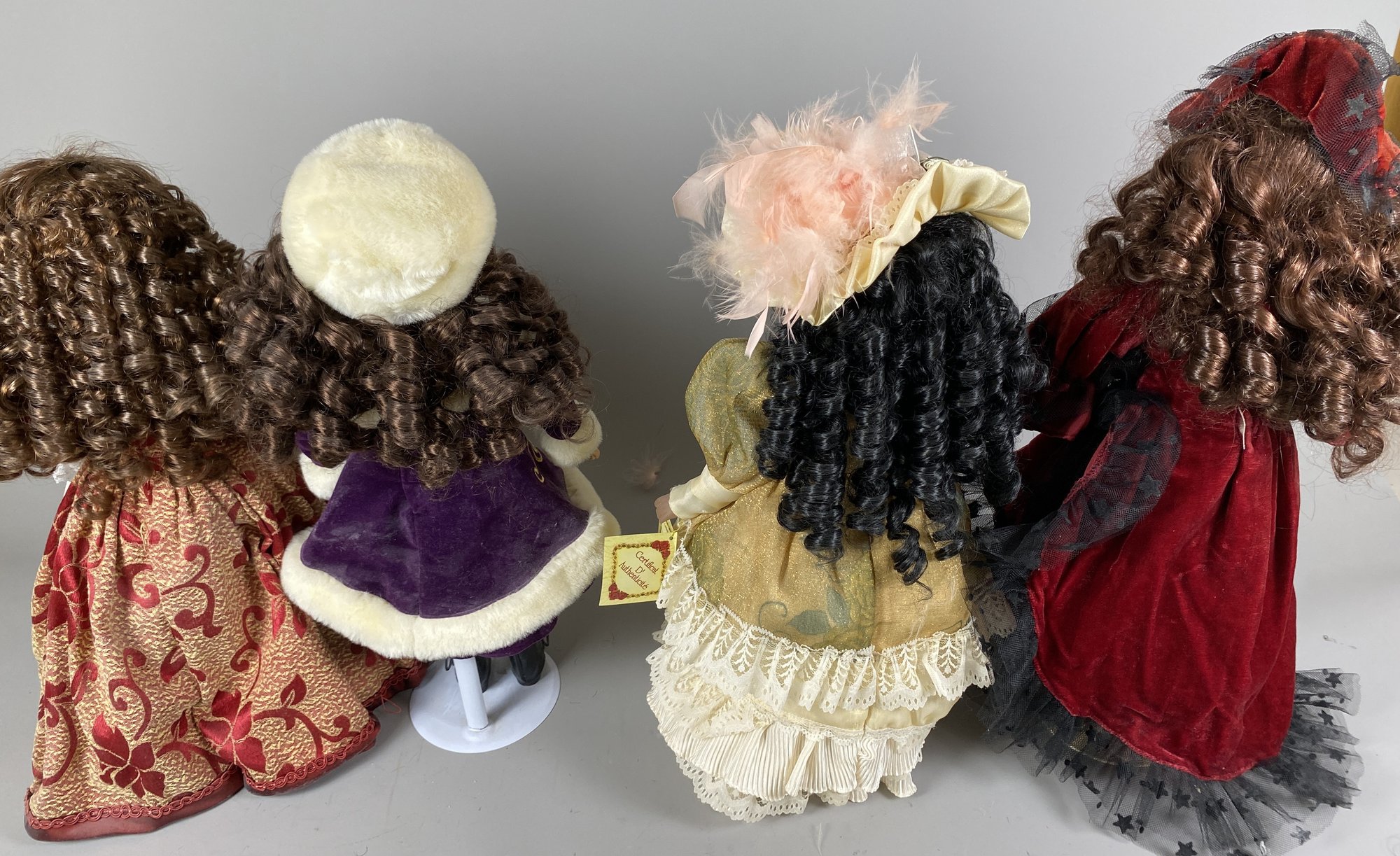 The dolls are in very good condition, although they need a bit of light dusting. The largest is about 18" tall. All have doll stands. Three of the dolls are Dan Dee Collector's Choice dolls. The doll without a hat is named Vivian.