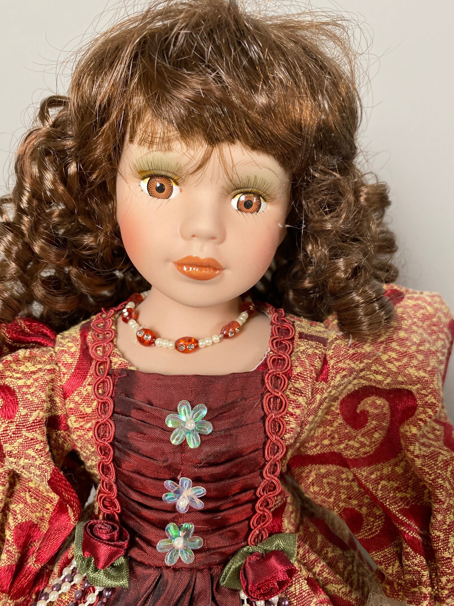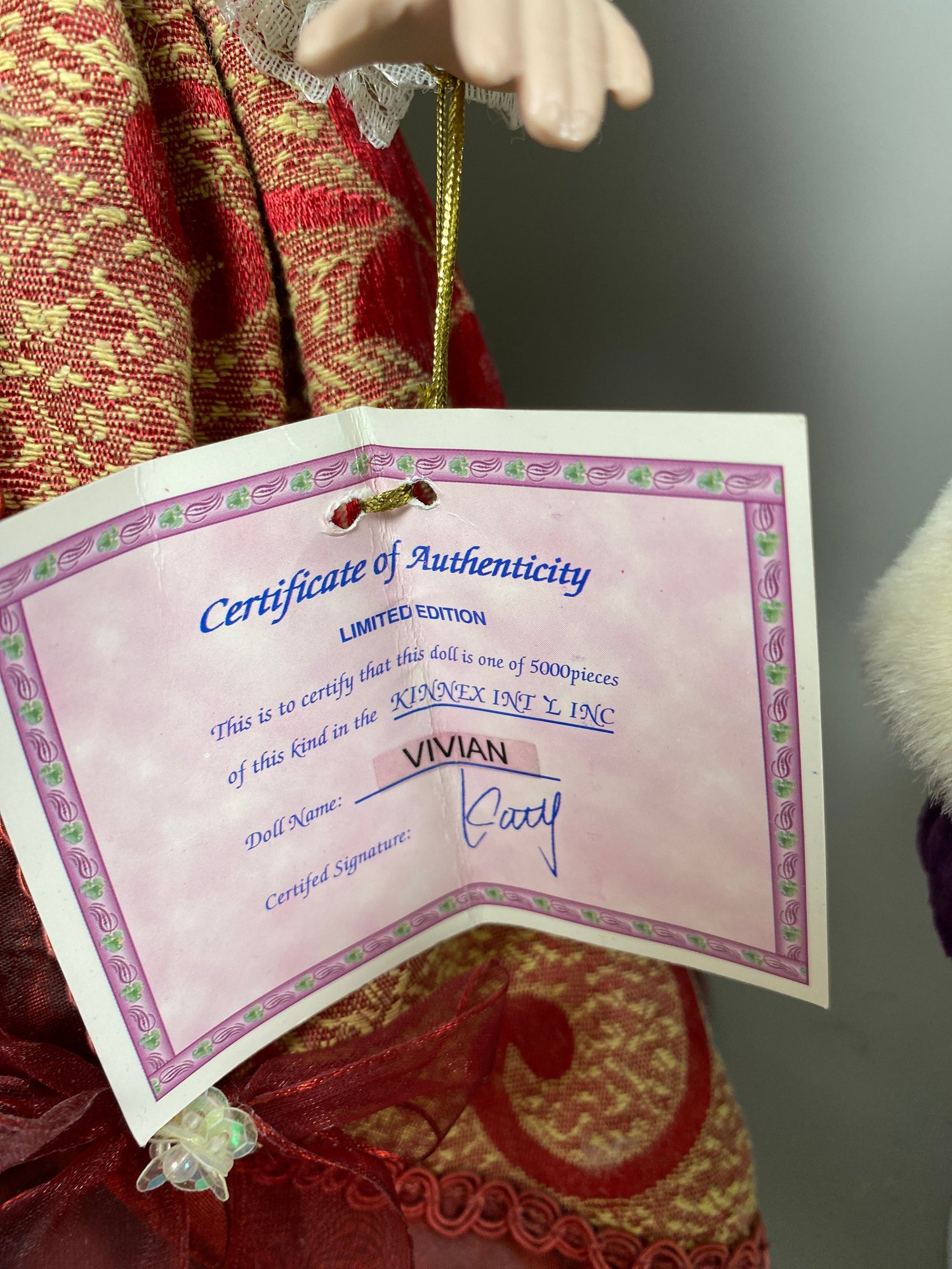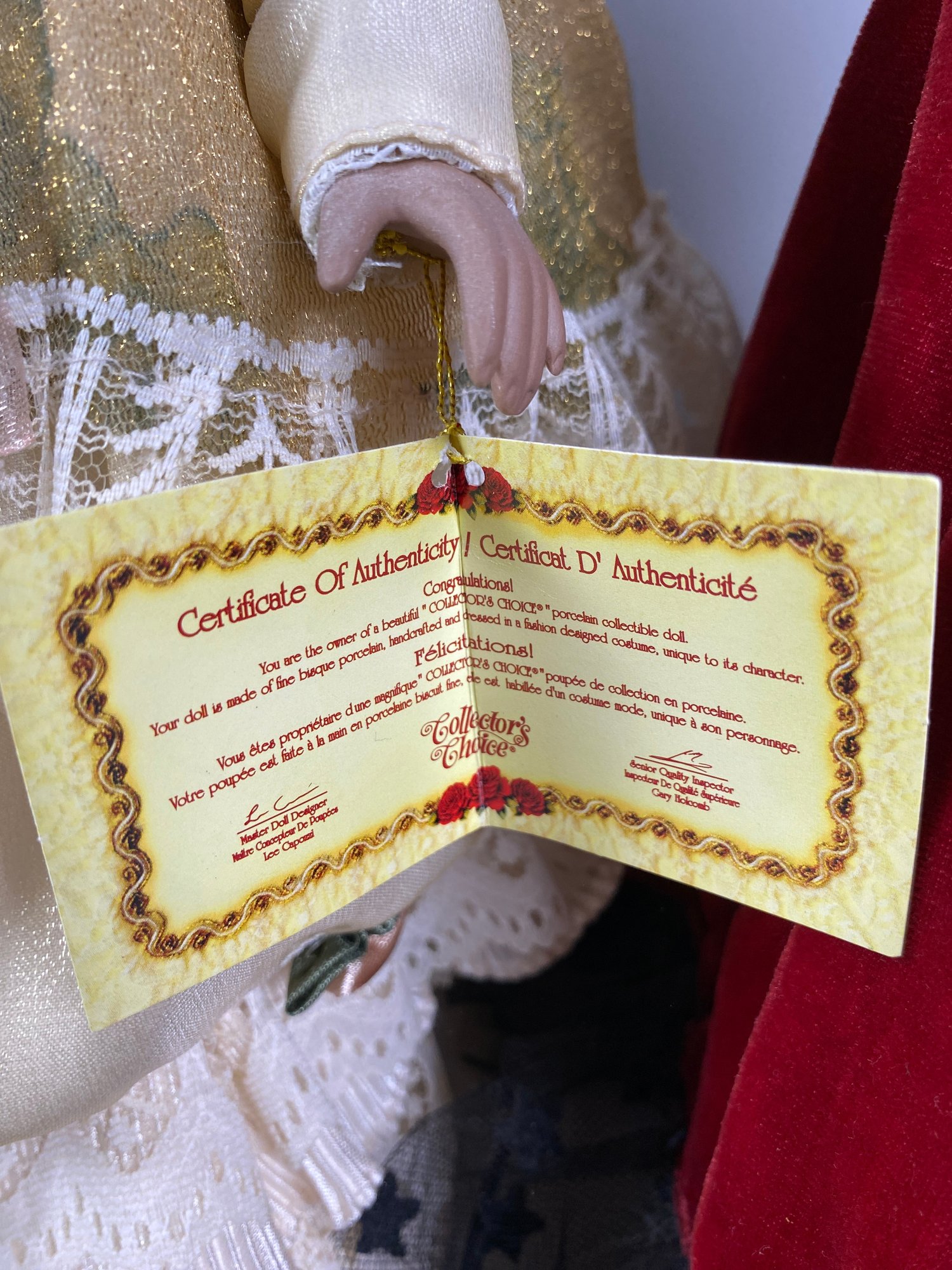 The dolls are in very good condition, although they need a bit of light dusting. The largest is about 18" tall. All have doll stands. Three of the dolls are Dan Dee Collector's Choice dolls. The doll without a hat is named Vivian.
