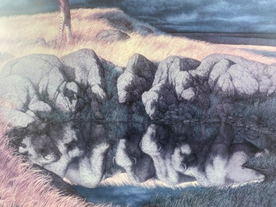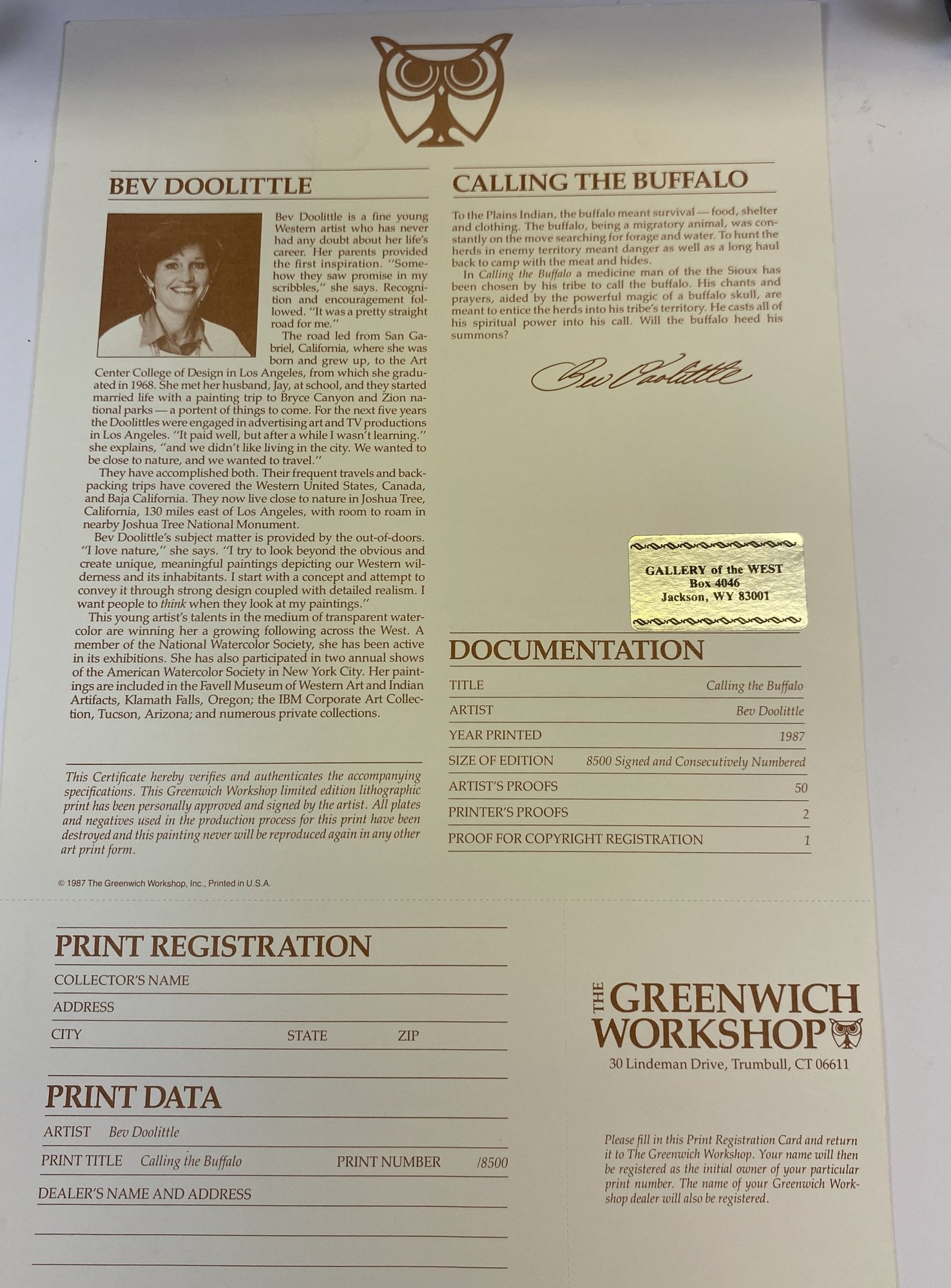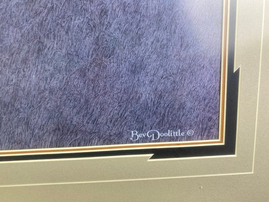 The piece is in very good condition. It is 42" x 23". It is signed by Bev Doolittle and number 2712. There are a few minor scratches on the wood frame.