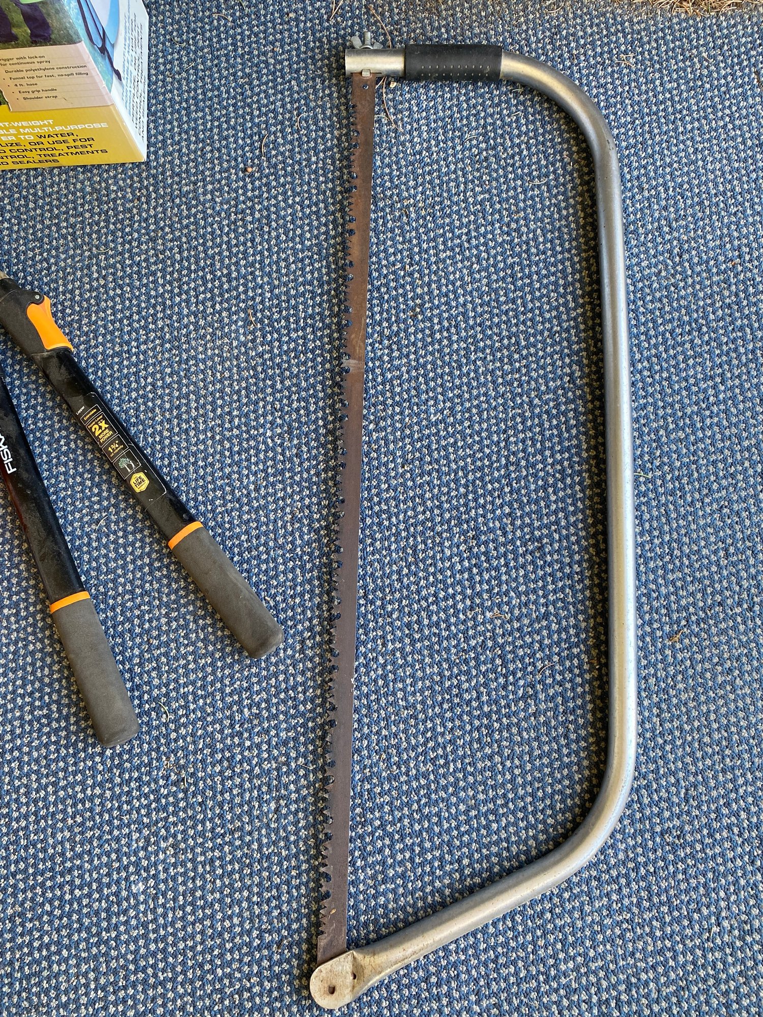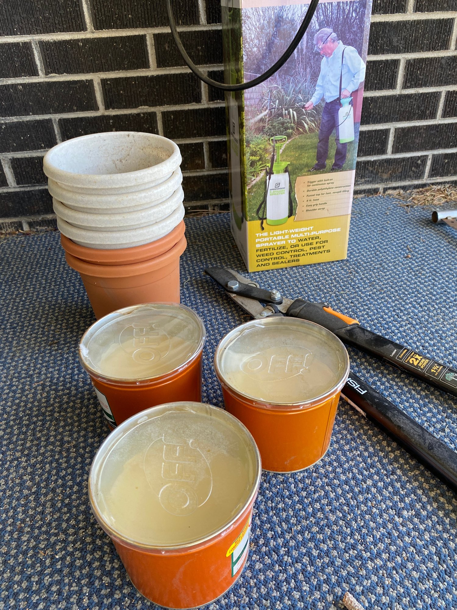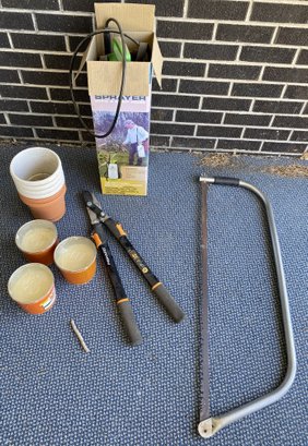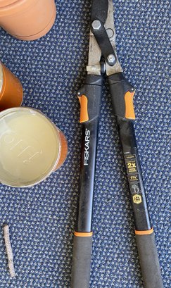 All pieces are in good, useful condition, and the Fiskars pruners appear to have been used very lightly. The pruners are approximately 25-1/4" long. The citronella candles appear to be unused.