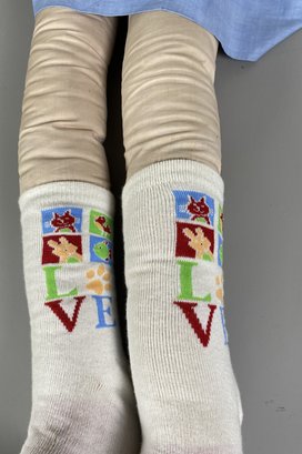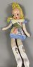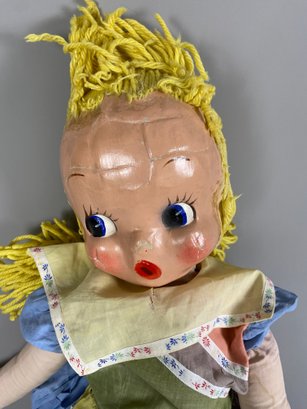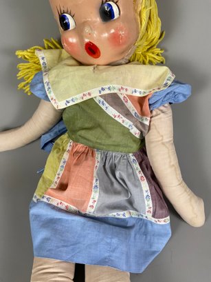 The doll is in good condition, particularly considering its age. It is soft-bodied, and the face is made of a plastic like fabric. The doll is approximately 39" tall.