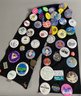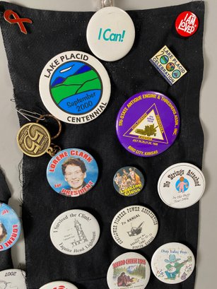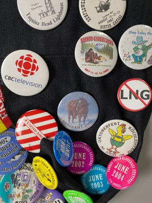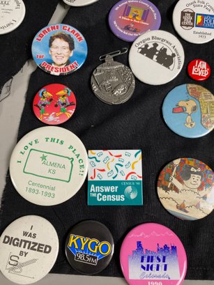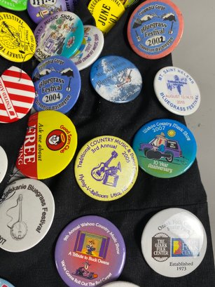 The pins appear to be in good condition and cover a variety of topics, many of which relate to blue grass festivals and travel locations.