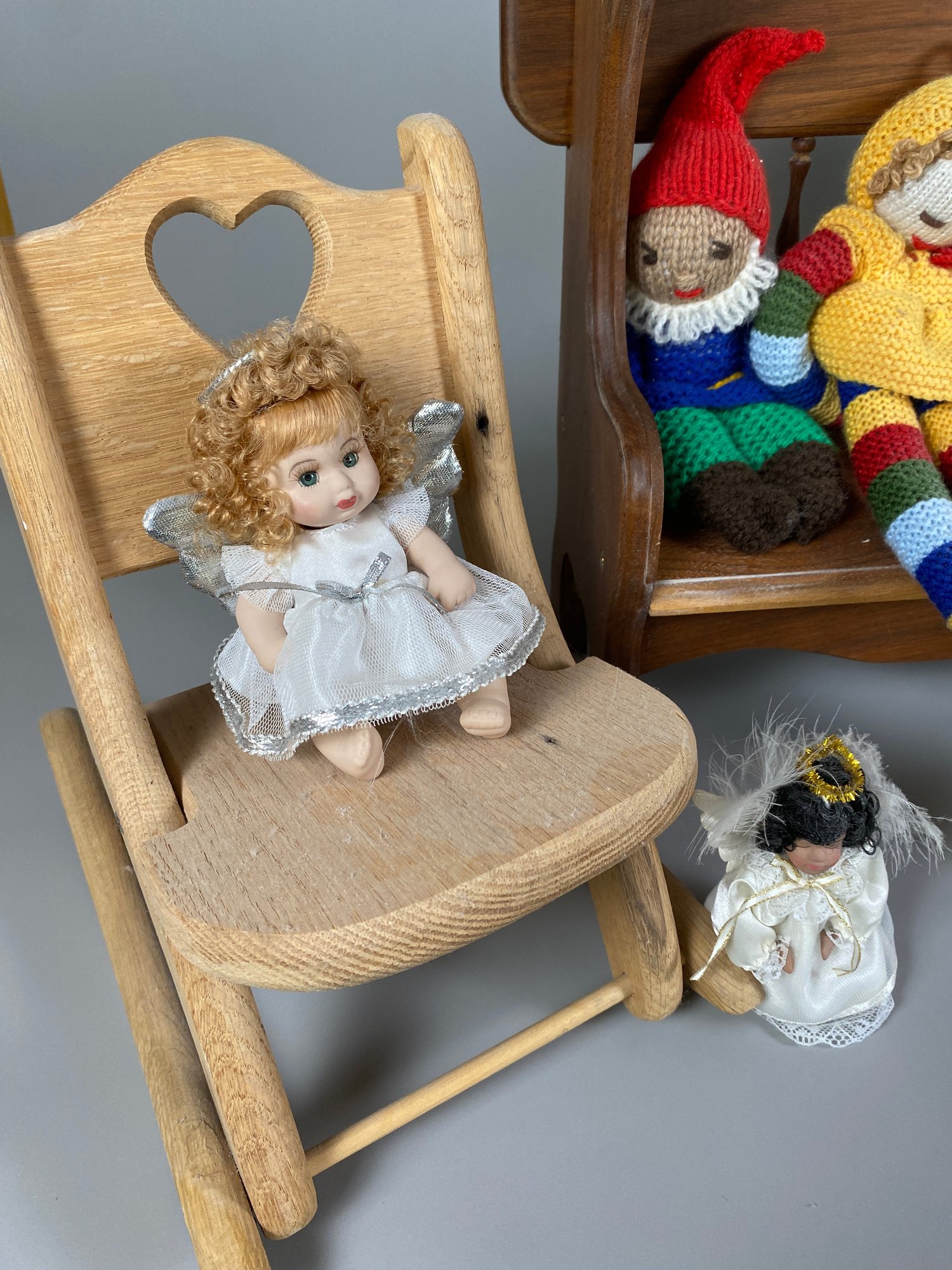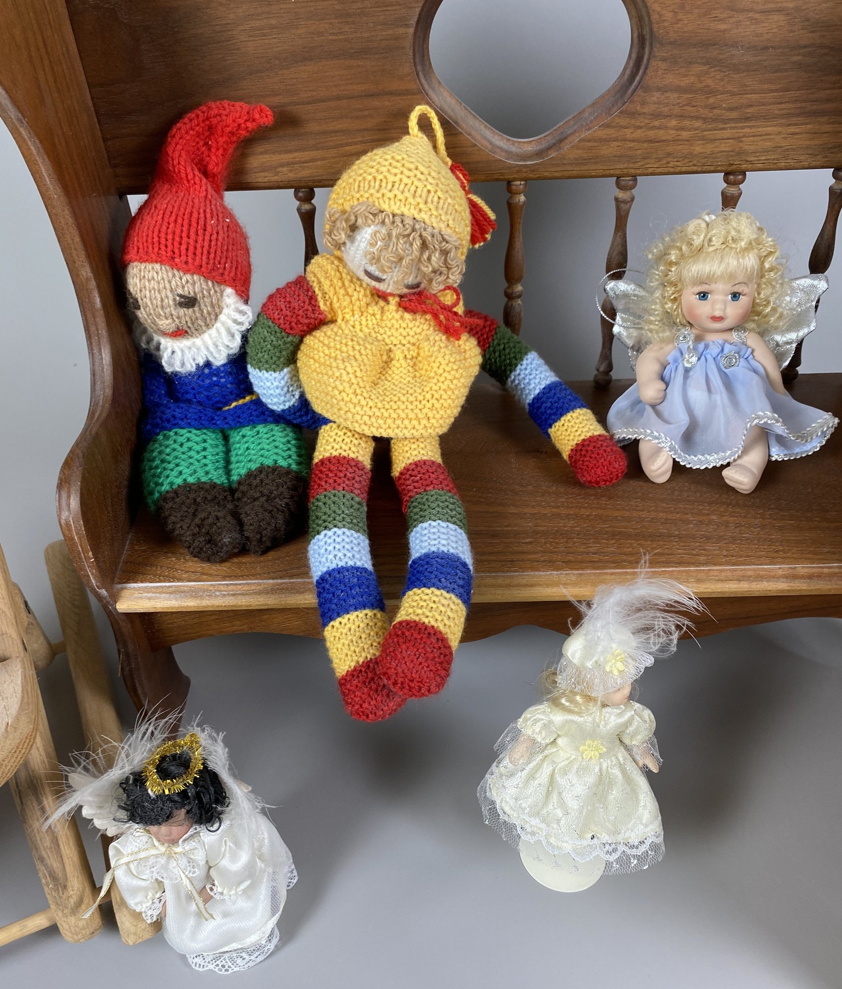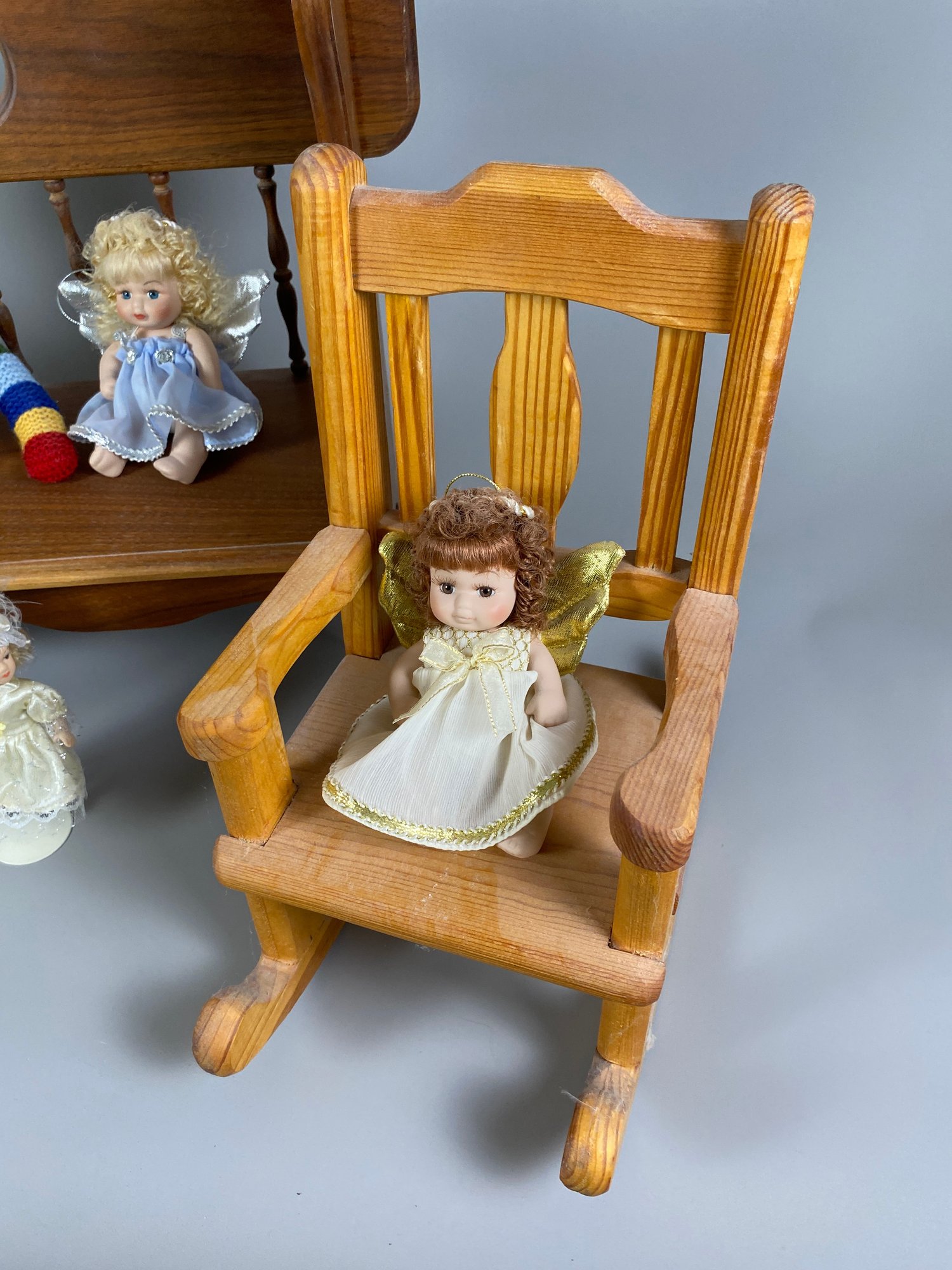 All pieces are in very good condition. The bench is 16-1/2" tall x 20-1/4" wide x 7" deep. Some of the dolls are porcelain.