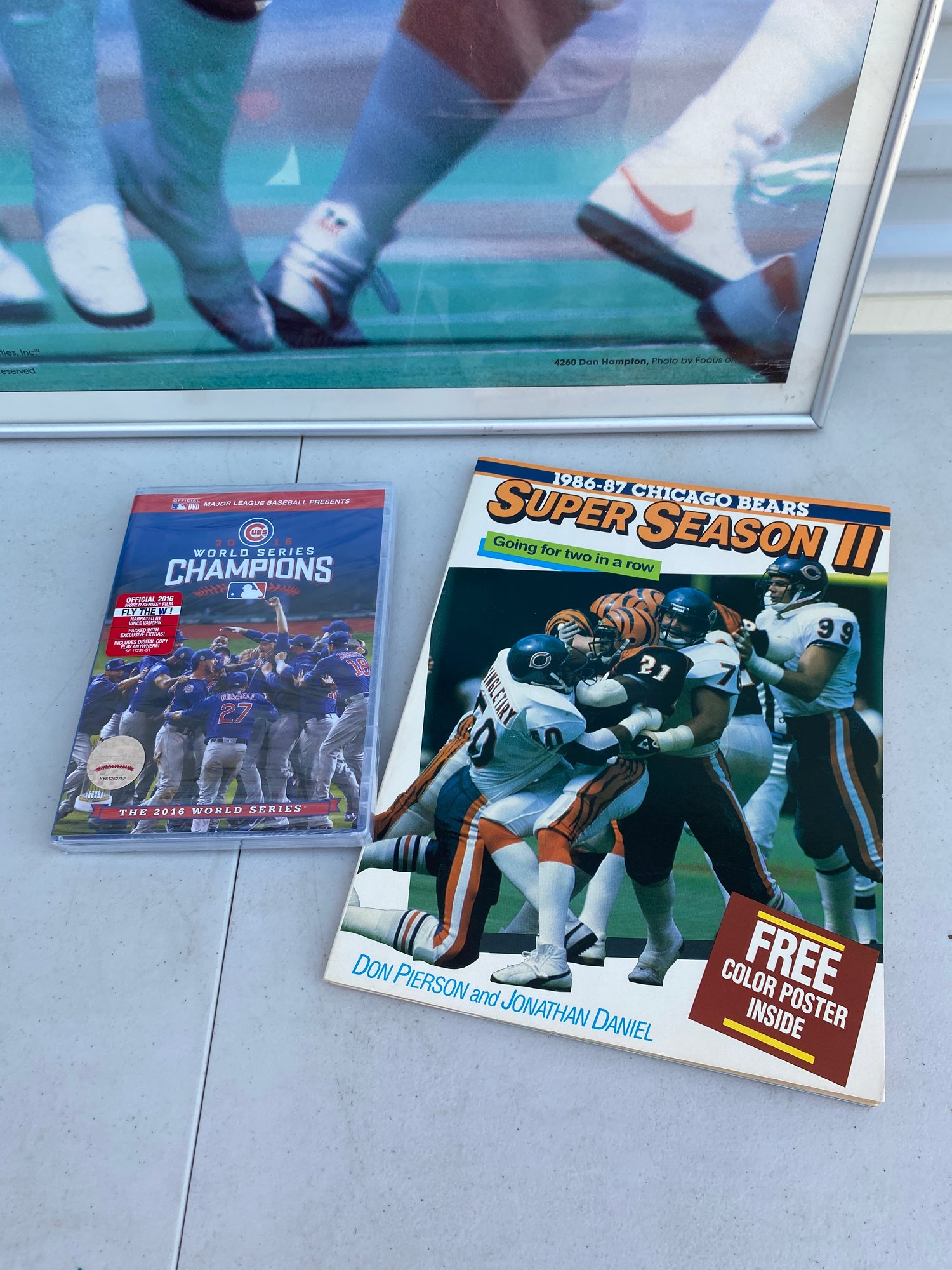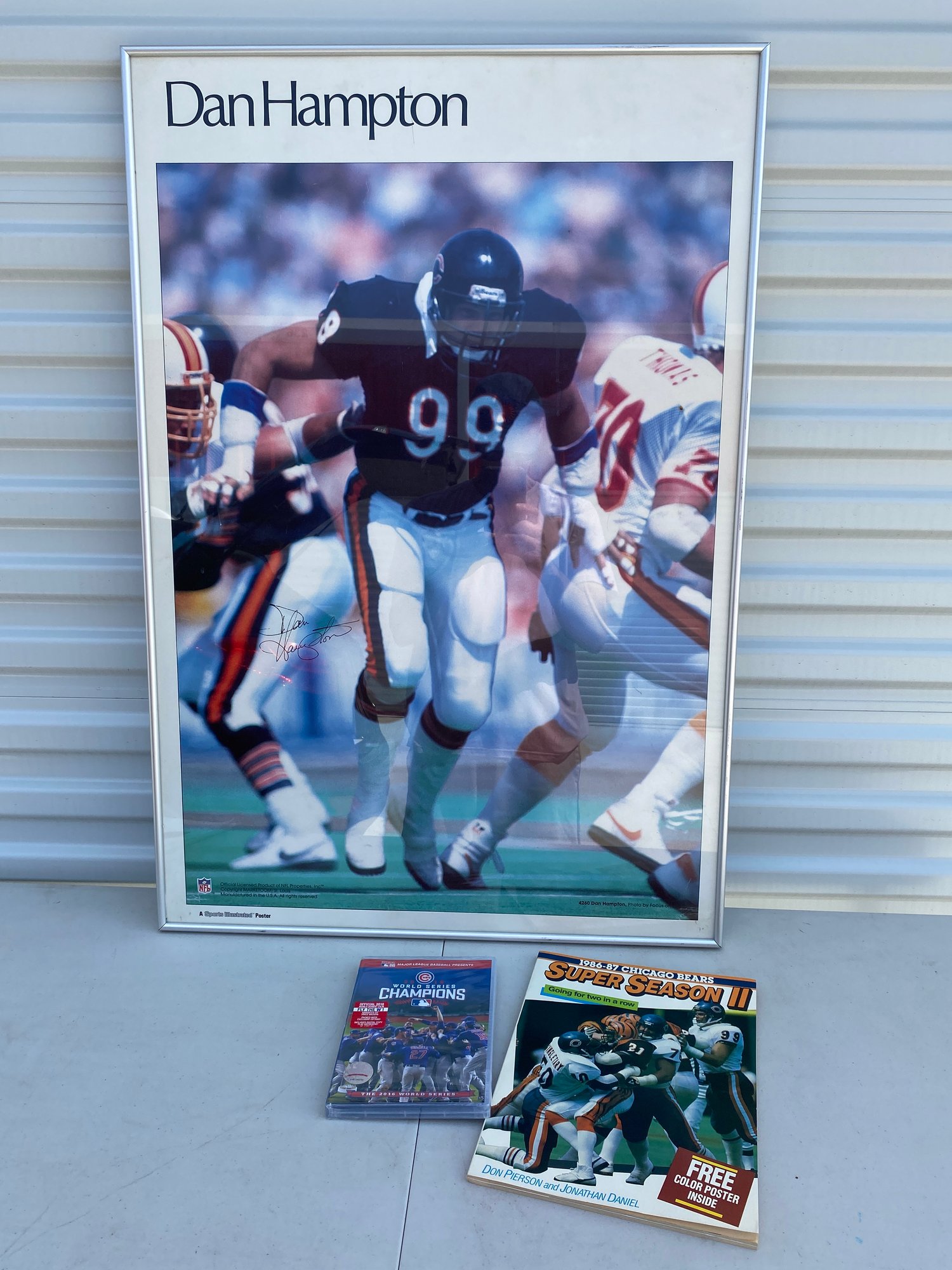 All pieces are in good condition, and the DVD has never been opened. The framed poster is 23-1/4" x 34". The poster of Dan Hampton is hand signed by the player.