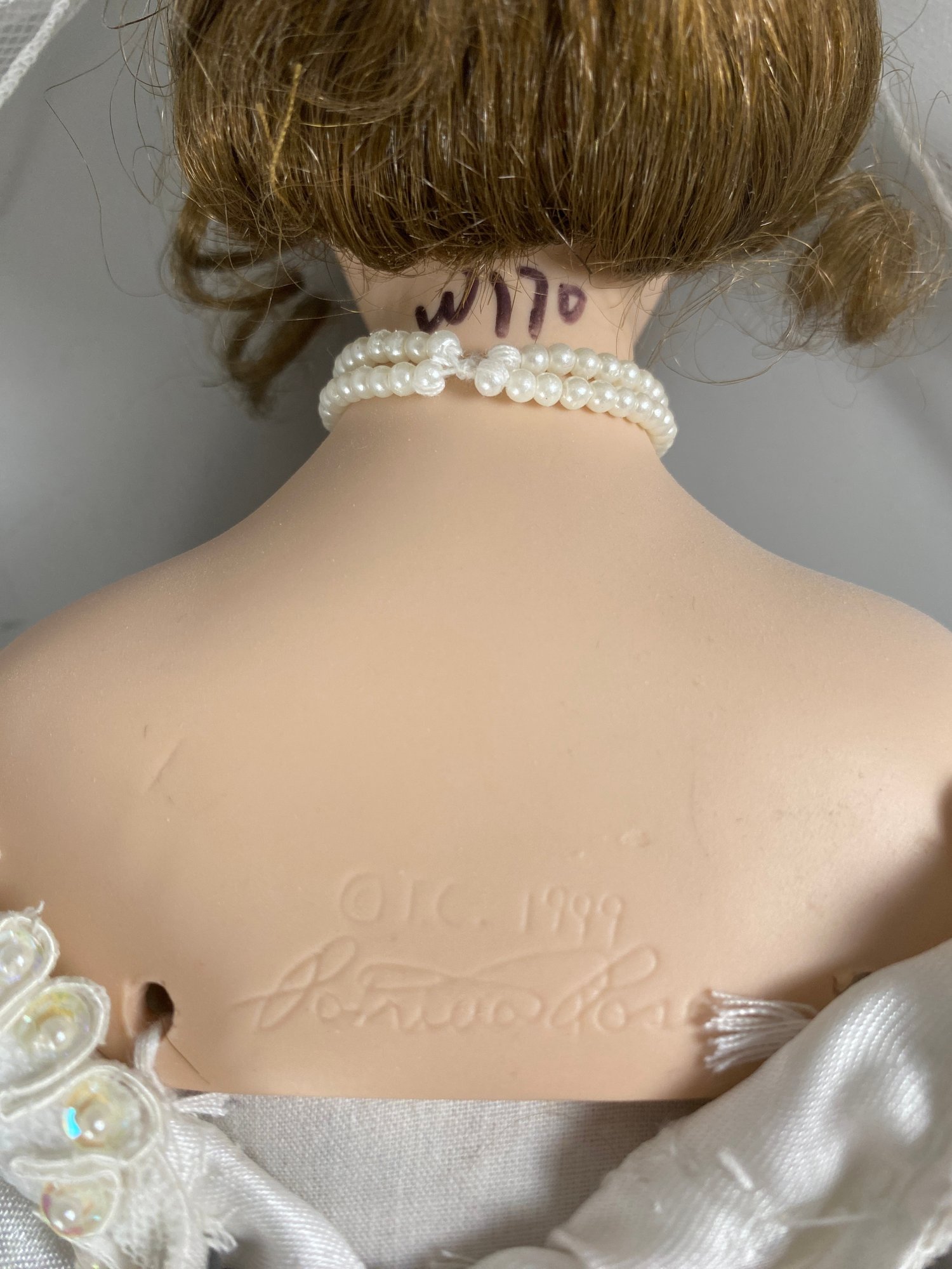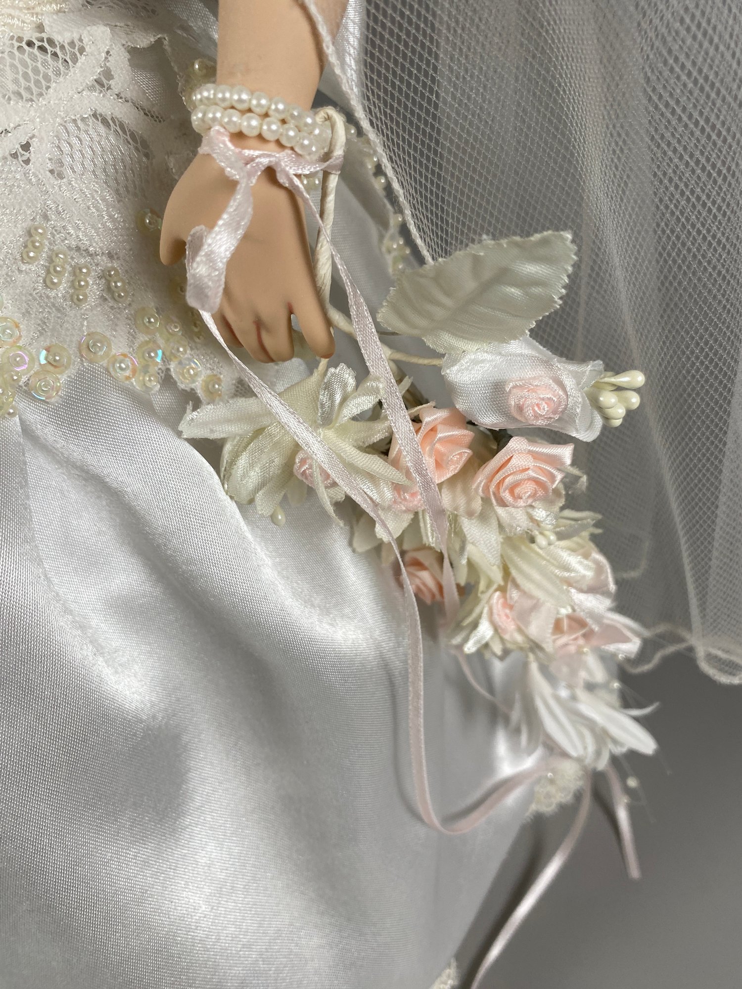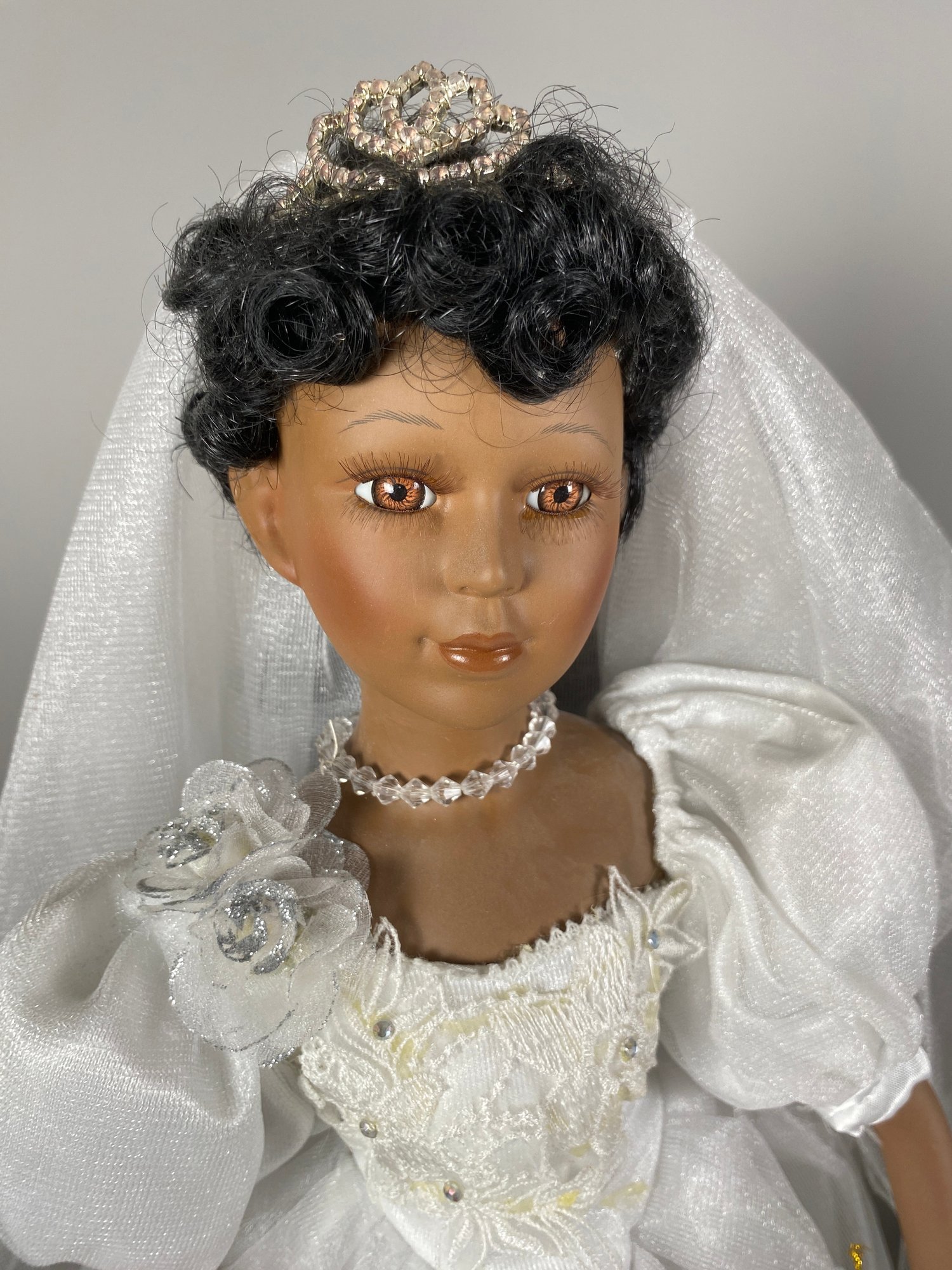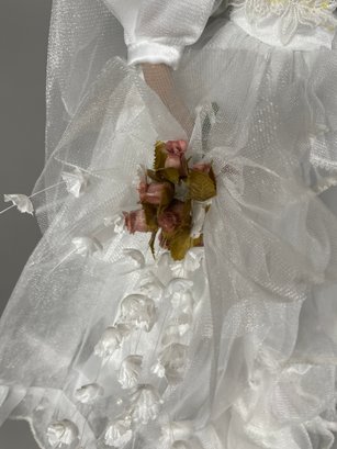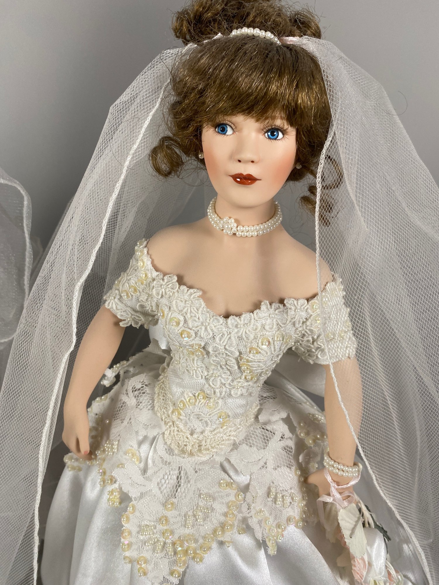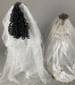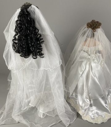 The dolls are in very good condition with wonderful details. The largest is approximately 23" tall. The shorter doll is a Paradise Galleries porcelain bride doll from the 1999 Treasury Collection, named 'June' and designed by artist Patricia Rose.