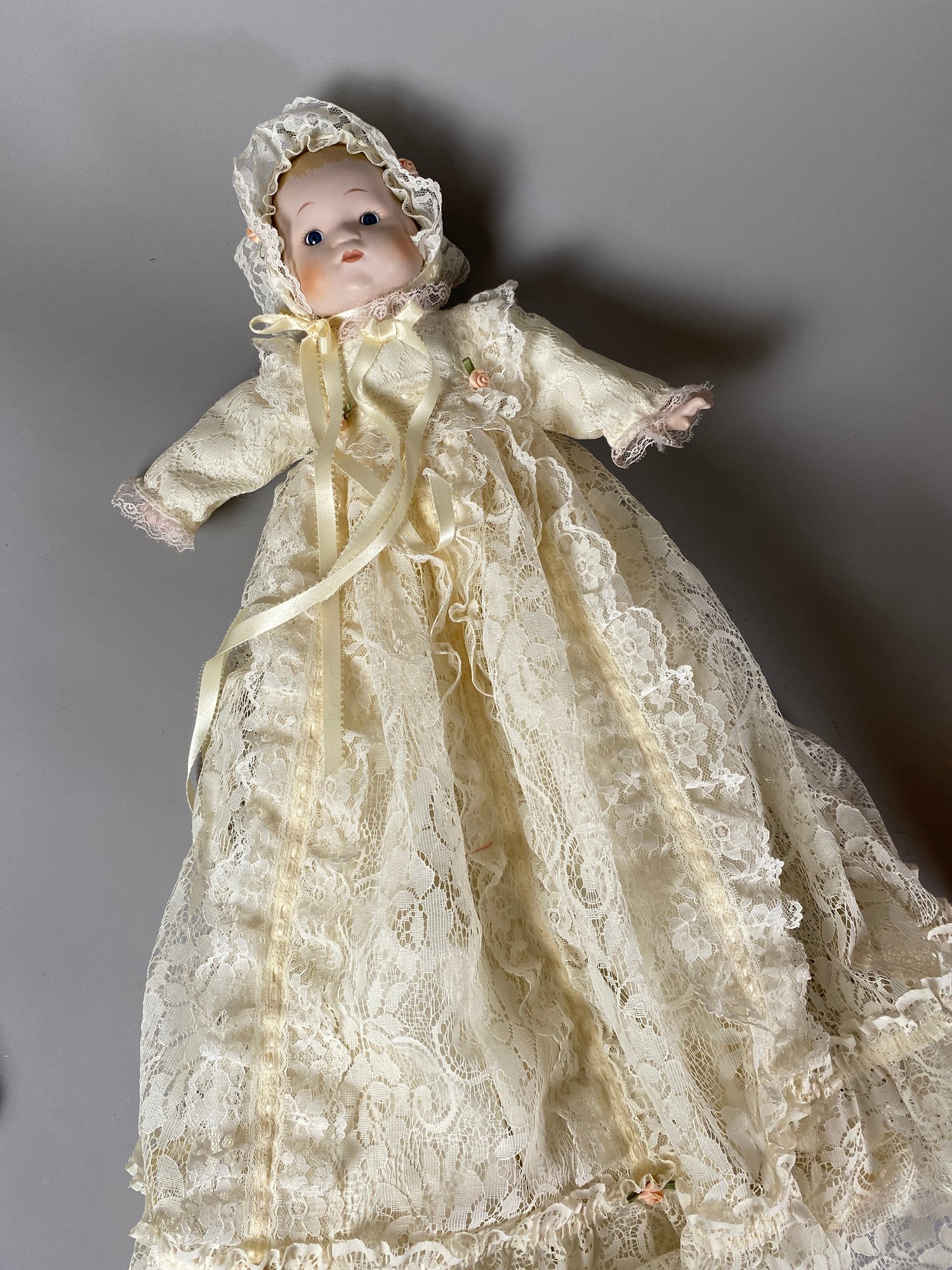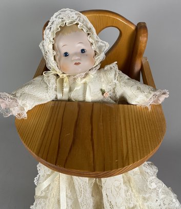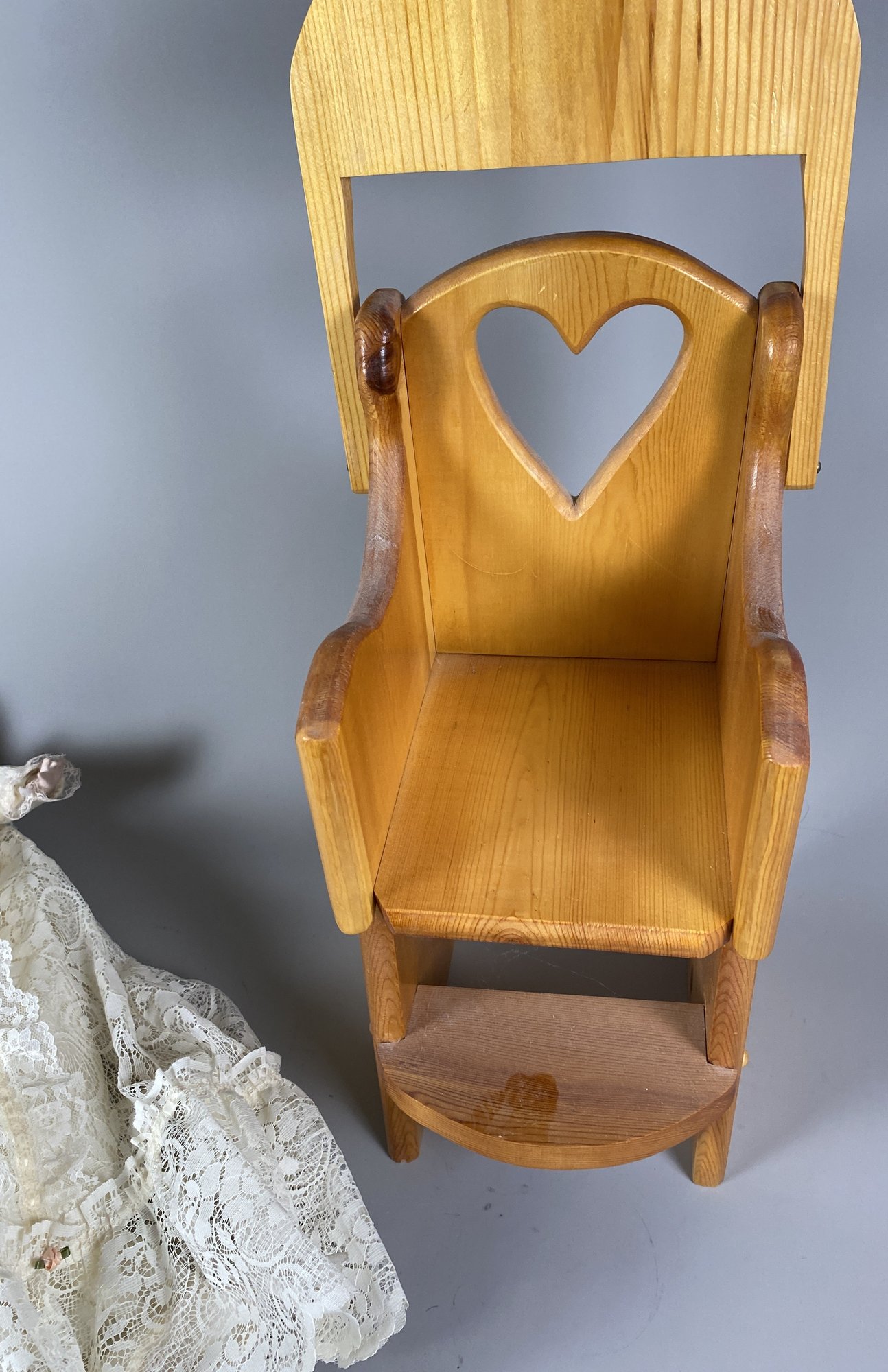 The doll and high chair are in very good condition. The high chair is 19" tall to the top of the backrest.