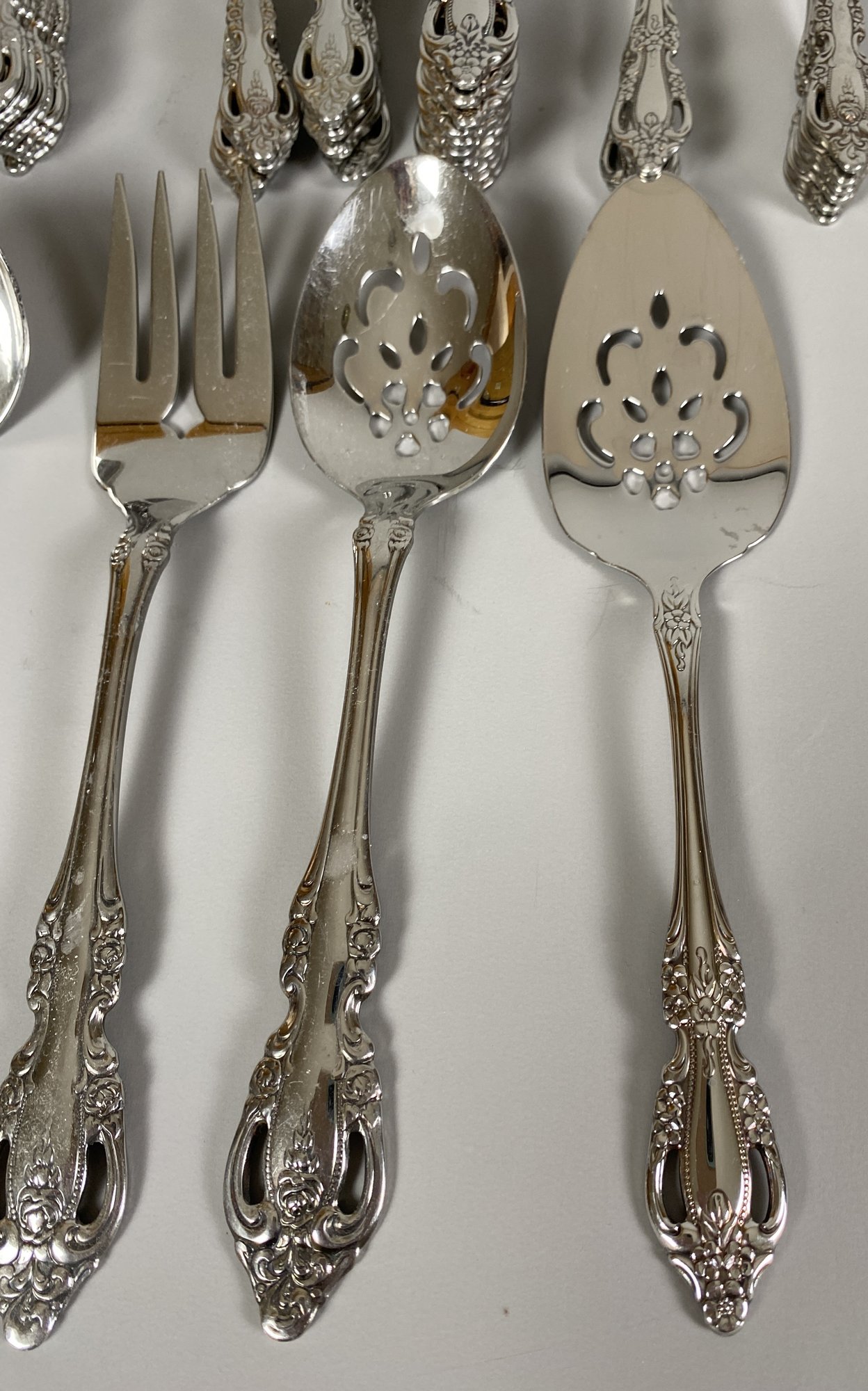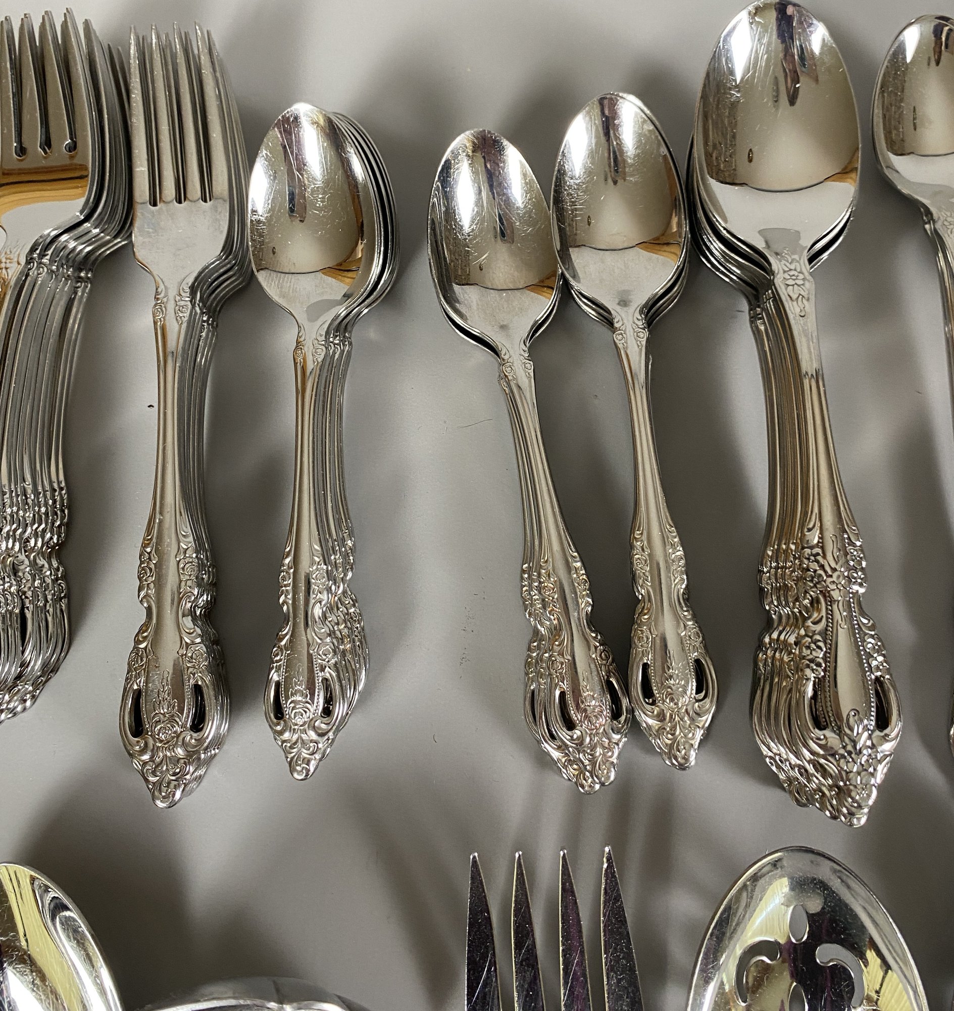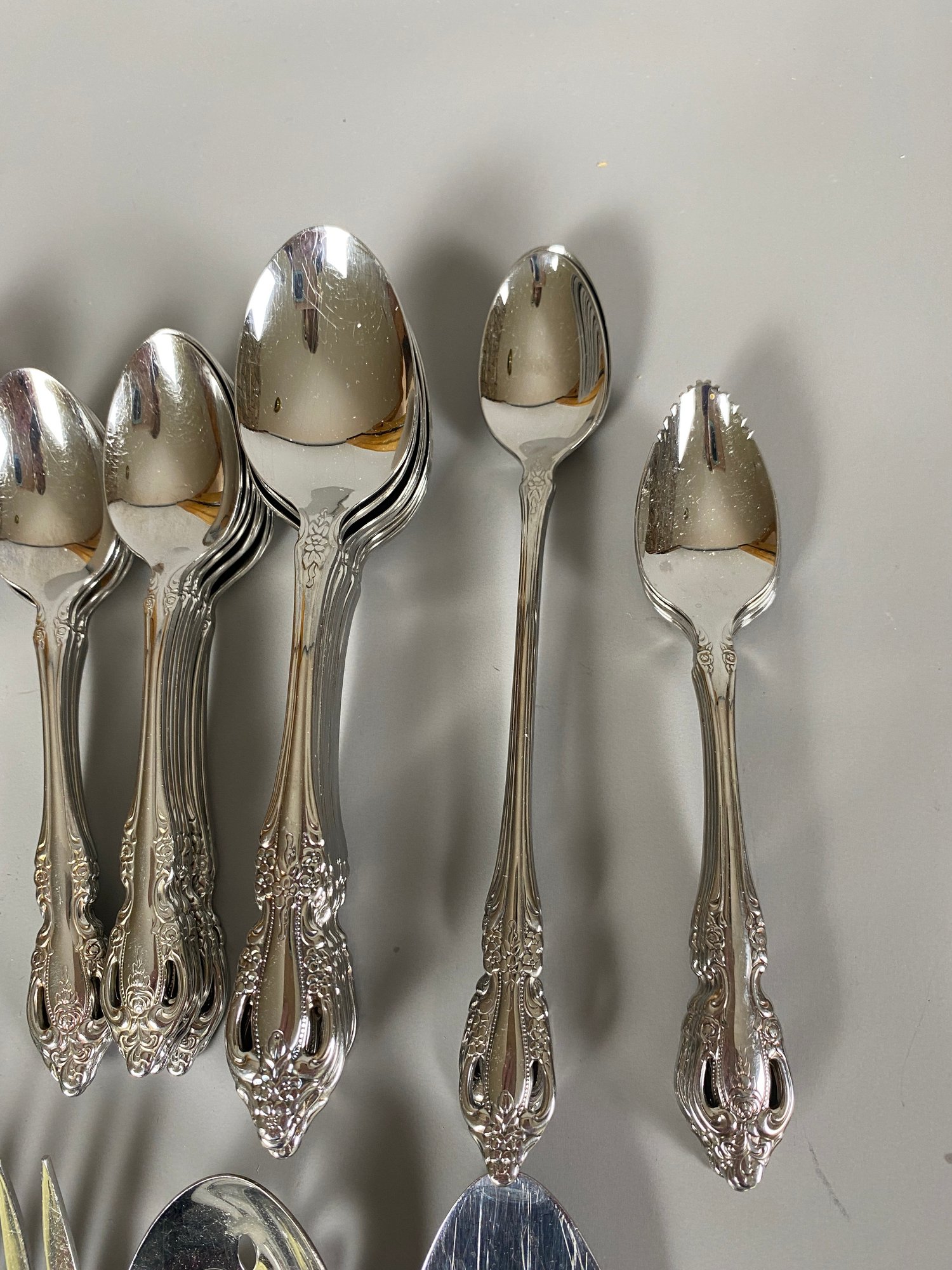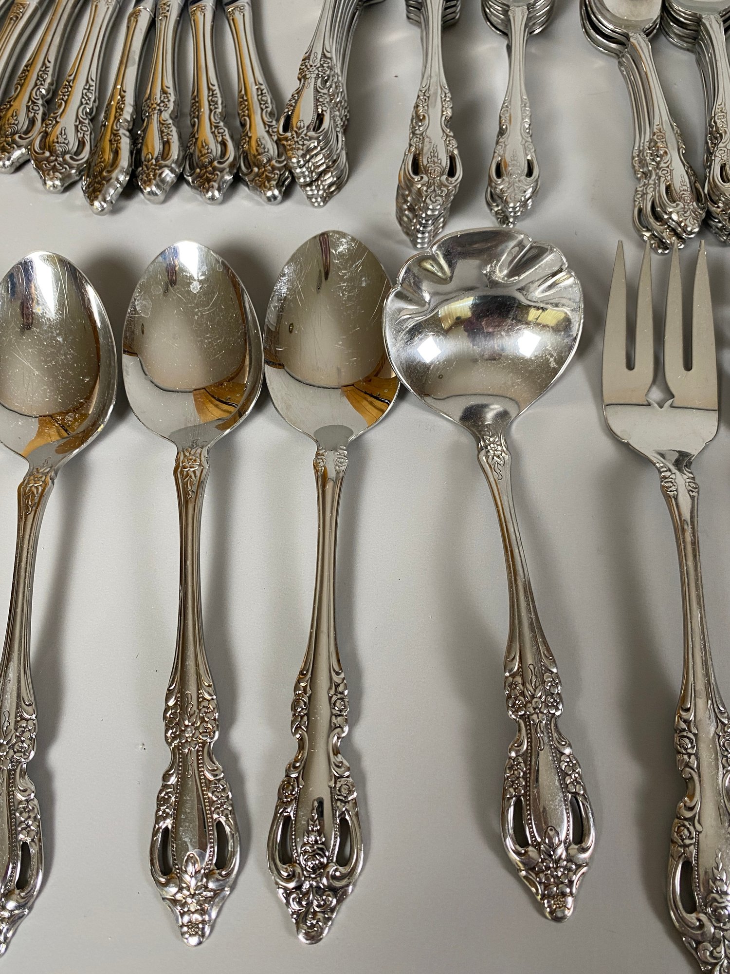 All of the pieces are in good, used condition. This is a mixed set of both Oneida patterns, Brahms and Raphael. There are a 11 dinner knives, 11 salad forks, 8 dinner forks, 20 teaspoons, 11 soup spoons, 3 ice tea spoons, 3 cocktail forks, 6 grapefruit spoons and several serving pieces.