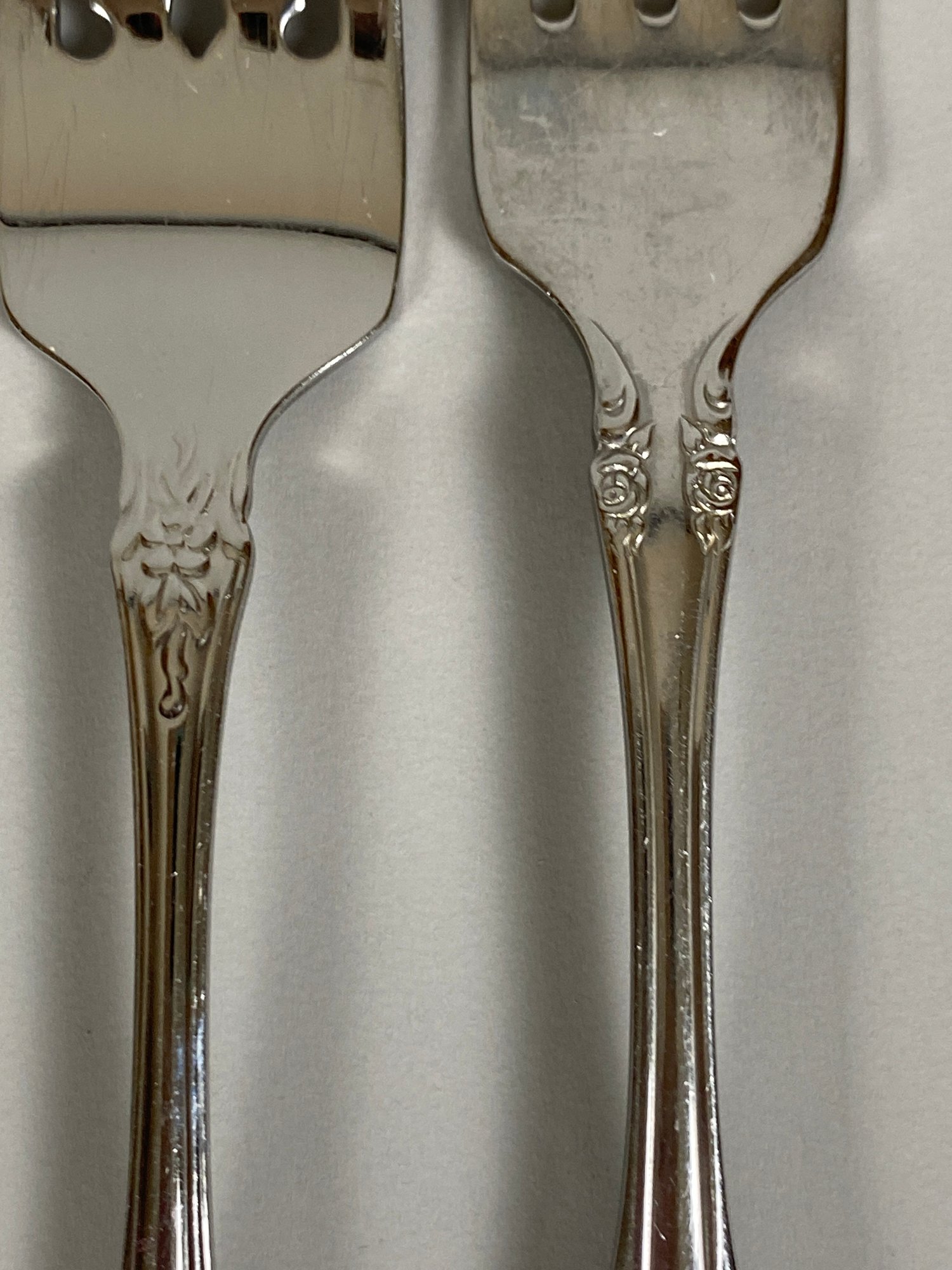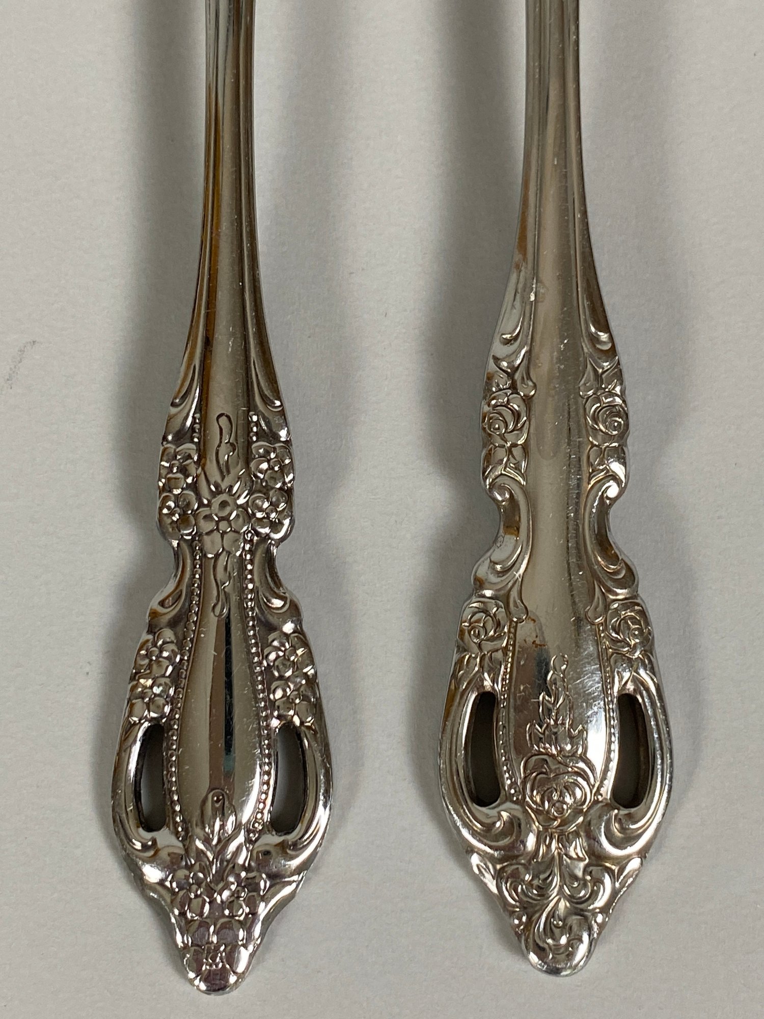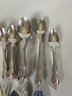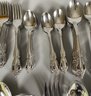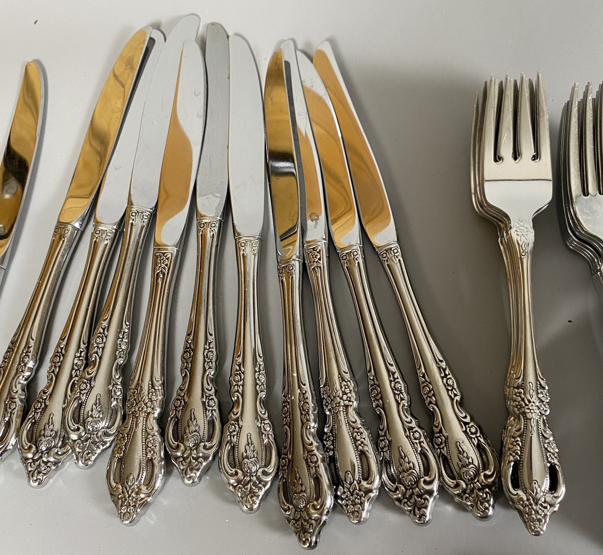 All of the pieces are in good, used condition. This is a mixed set of both Oneida patterns, Brahms and Raphael. There are a 11 dinner knives, 11 salad forks, 8 dinner forks, 20 teaspoons, 11 soup spoons, 3 ice tea spoons, 3 cocktail forks, 6 grapefruit spoons and several serving pieces.
