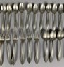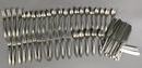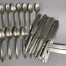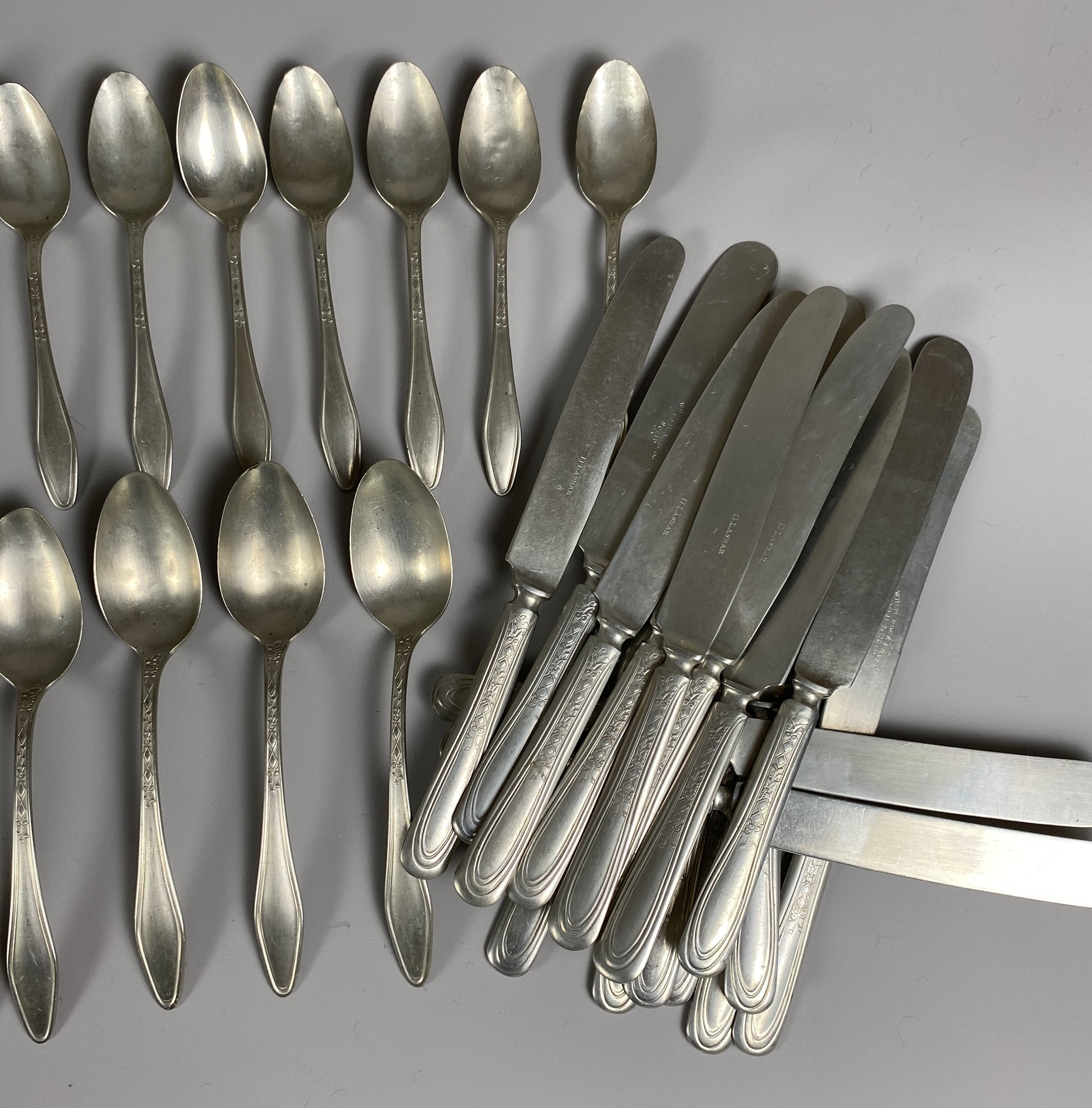 The pieces are in good, used condition. A few pieces have minor signs of wear. There are two marks on the pieces: White Rock Silver and Lashar. The knives are 9-1/8" long. The lot includes 15 knives.
