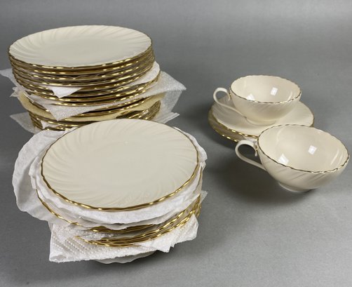 The set is in very good, lightly used condition. The salad plates are approximately 7-3/4" in diameter. There are 17 salad plates, 10 bread plates, and 2 cups and saucers.