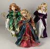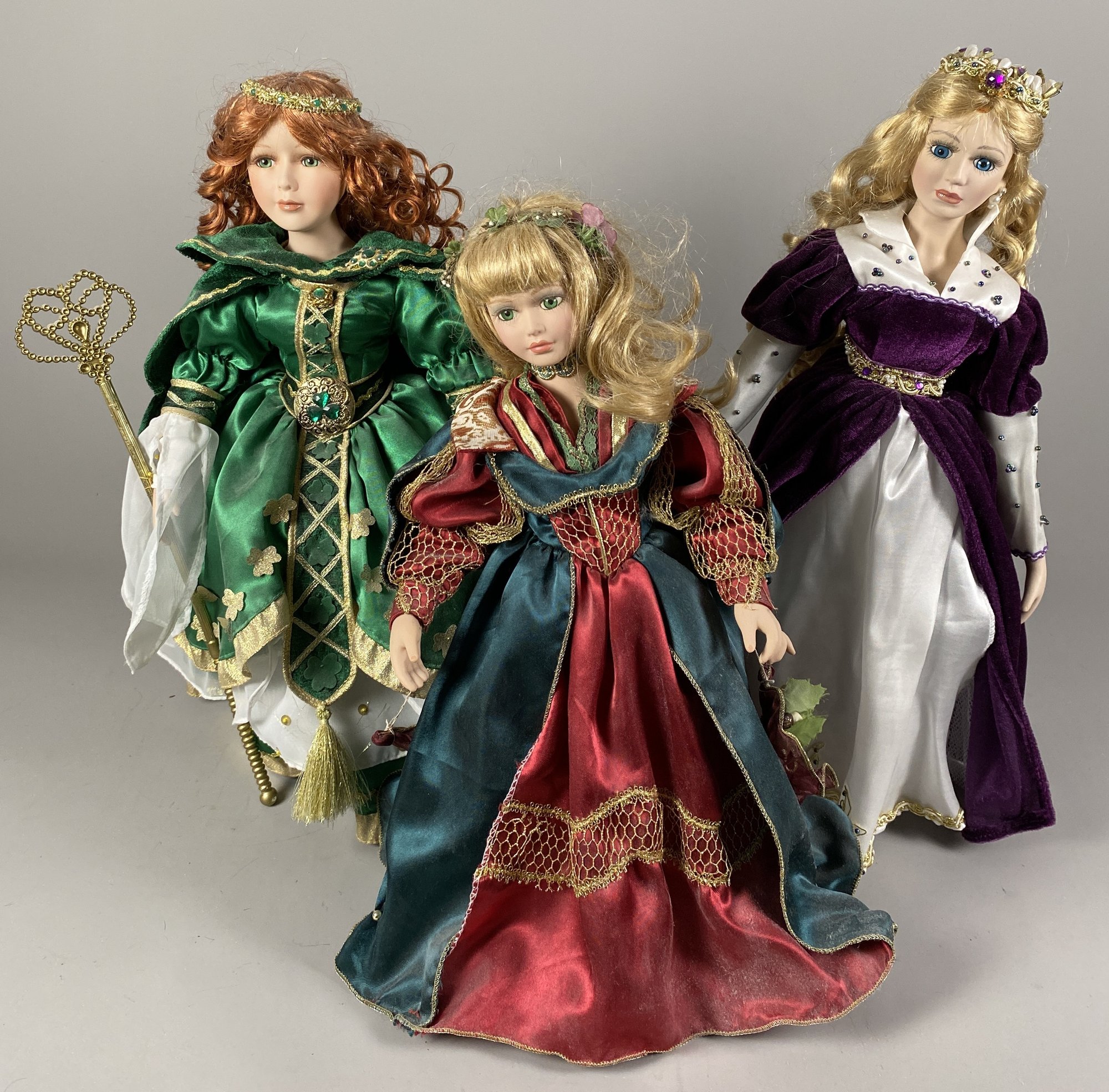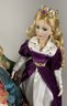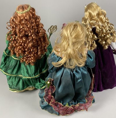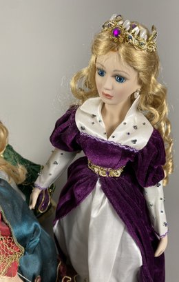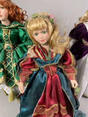 The dolls are in very good condition. Their heads and hands are porcelain. Their legs may also be porcelain. The doll in the green dress is approximately 17-3/4" tall.