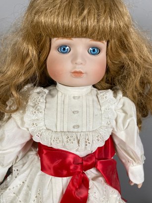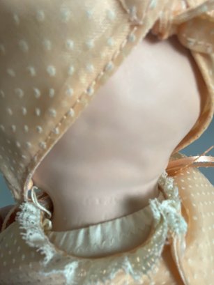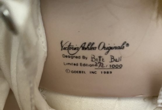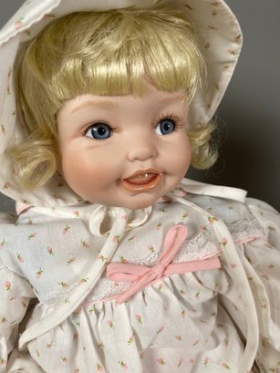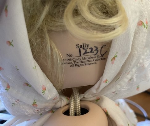 The dolls are in very good condition. They just need a light dusting. The Goebel Victoria Ashley Originals doll is a limited edition doll by Bette Ball and is about 19-1/2" tall. The sitting doll is marked Sally by the Hamilton Collection. The baby laying down is marked, but it's difficult to read.