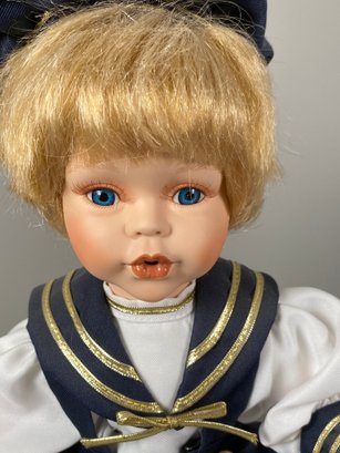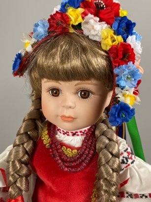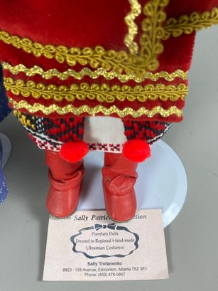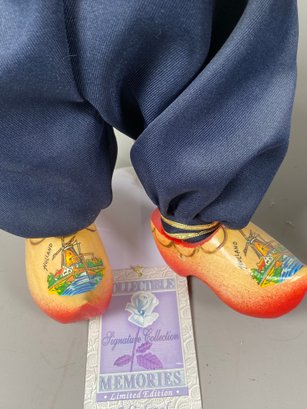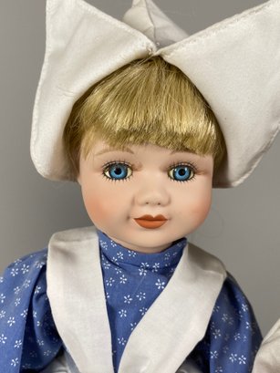 The dolls are in very good condition, although they need a bit of light dusting. The tallest one is approximately 16" tall. They all have doll stands. The unmarked Dutch girl doll appears to be a House of Lloyd Christmas Around The World "Jana" Dutch porcelain doll.