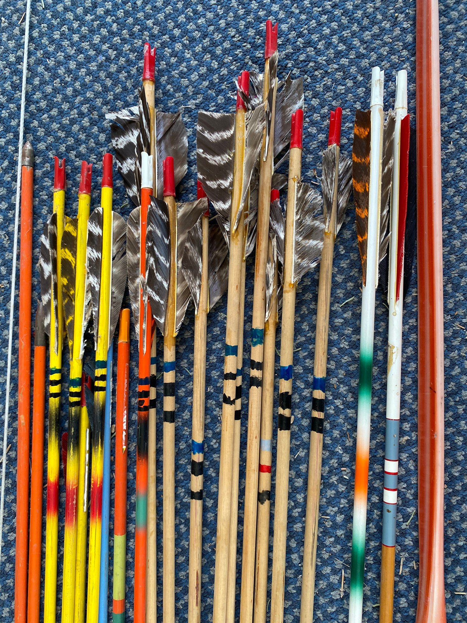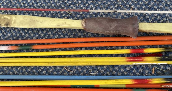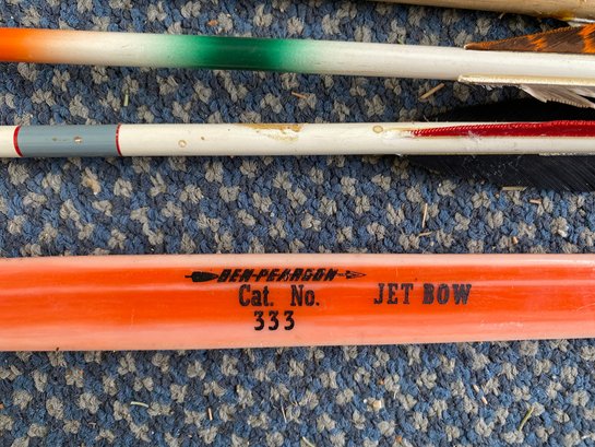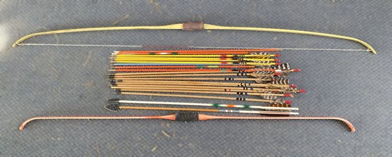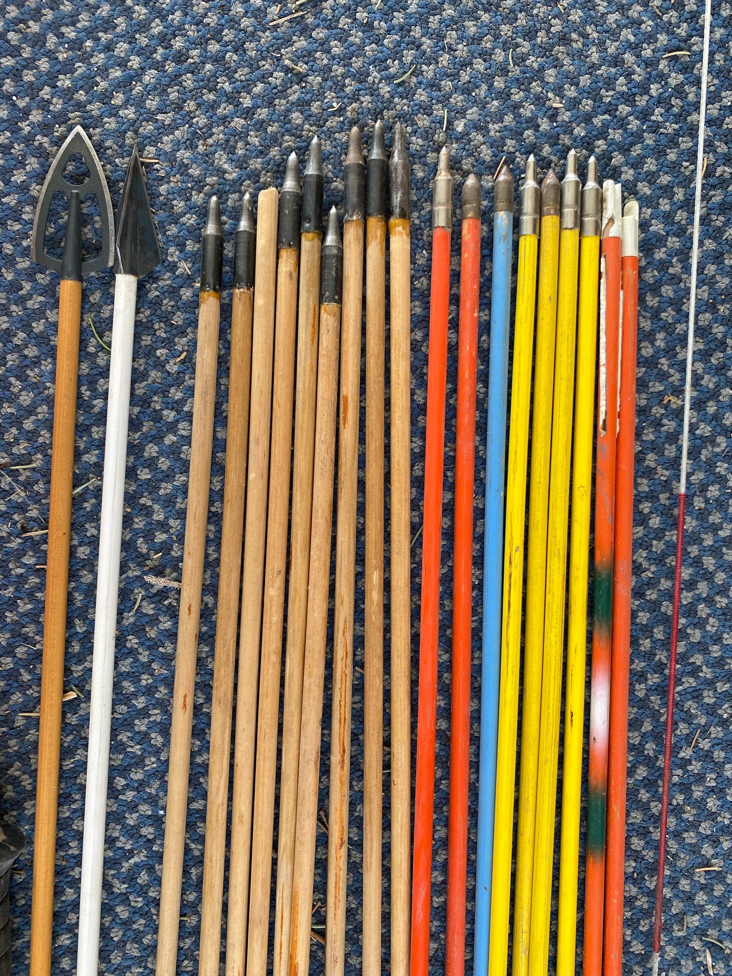 All of the pieces are in vintage, used condition and may need some maintenance. The larger bow does not have a string and is about 61-1/2" long.