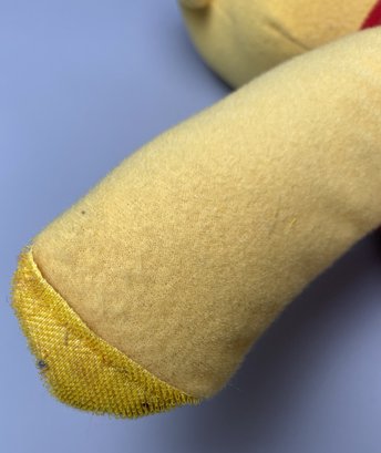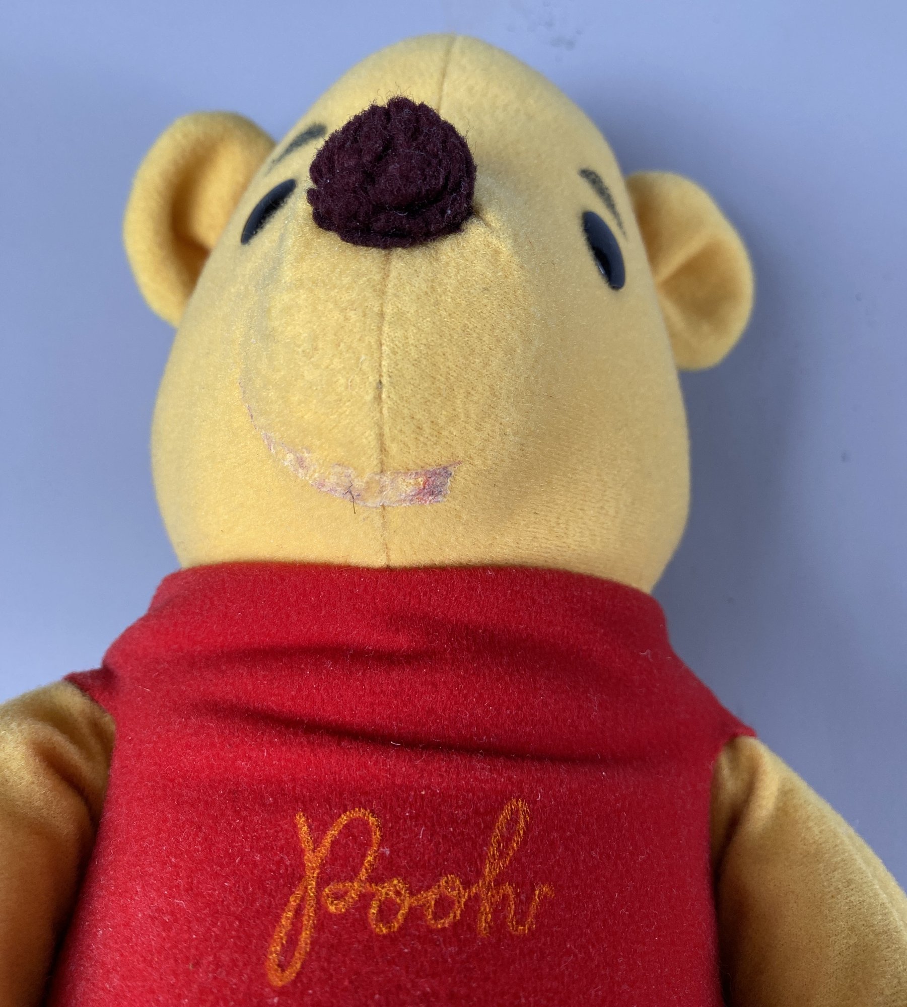 The Pooh Bear is in good, loved condition. His smile has faded (but not his loving spirit.) He measures about 12-1/2" when sitting.